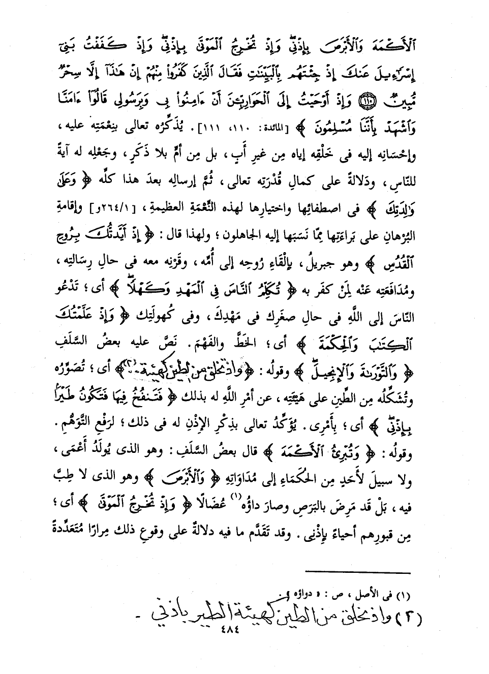 يُذَكِّرُهُ تَعَالَى بِنِعْمَتِهِ عَلَيْهِ، وَإِحْسَانِهِ إِلَيْهِ فِي خَلْقِهِ إِيَّاهُ مِنْ غَيْرِ أَبٍ، بَلْ مِنْ أُمٍّ بِلَا ذَكَرٍ، وَجَعْلِهِ لَهُ آيَةً لِلنَّاسِ، وَدَلَالَةً عَلَى كَمَالِ قُدْرَتِهِ تَعَالَى، ثُمَّ إِرْسَالِهِ بَعْدَ هَذَا كُلِّهِ {وَعَلَى وَالِدَتِكَ} [المائدة: 110] فِي اصْطِفَائِهَا وَاخْتِيَارِهَا لِهَذِهِ النِّعْمَةِ الْعَظِيمَةِ، وَإِقَامَةِ الْبُرْهَانِ عَلَى بَرَاءَتِهَا مِمَّا نَسَبَهَا إِلَيْهِ الْجَاهِلُونَ ; وَلِهَذَا قَالَ: {إِذْ أَيَّدْتُكَ بِرُوحِ الْقُدُسِ} [المائدة: 110] وَهُوَ جِبْرِيلُ، بِإِلْقَاءِ رُوحِهِ إِلَى أُمِّهِ، وَقَرْنِهِ مَعَهُ فِي حَالِ رِسَالَتِهِ، وَمُدَافَعَتِهِ عَنْهُ لِمَنْ كَفَرَ بِهِ {تُكَلِّمُ النَّاسَ فِي الْمَهْدِ وَكَهْلًا} [المائدة: 110] أَيْ: تَدْعُو النَّاسَ إِلَى اللَّهِ فِي حَالِ صِغَرِكَ فِي مَهْدِكَ، وَفِي كُهُولَتِكَ {وَإِذْ عَلَّمْتُكَ الْكِتَابَ وَالْحِكْمَةَ} [المائدة: 110] أَيِ الْخَطَّ وَالْفَهْمَ. نَصَّ عَلَيْهِ بَعْضُ السَّلَفِ {وَالتَّوْرَاةَ وَالْإِنْجِيلَ} [المائدة: 110] وَقَوْلُهُ {وَإِذْ تَخْلُقُ مِنَ الطِّينِ كَهَيْئَةِ الطَّيْرِ بِإِذْنِي} [المائدة: 110] أَيْ: تُصَوِّرُهُ وَتُشَكِّلُهُ مِنَ الطِّينِ عَلَى هَيْئَتِهِ، عَنْ أَمْرِ اللَّهِ لَهُ بِذَلِكَ {فَتَنْفُخُ فِيهَا فَتَكُونُ طَيْرًا بِإِذْنِي} [المائدة: 110] أَيْ: بِأَمْرِي. يُؤَكِّدُ تَعَالَى بِذِكْرِ الْإِذْنِ لَهُ فِي ذَلِكَ ; لِرَفْعِ التَّوَهُّمِ. وَقَوْلُهُ: {وَتُبْرِئُ الْأَكْمَهَ} [المائدة: 110] قَالَ بَعْضُ السَّلَفِ: وَهُوَ الَّذِي يُولَدُ أَعْمَى، وَلَا سَبِيلَ لِأَحَدٍ مِنَ الْحُكَمَاءِ إِلَى مُدَاوَاتِهِ {وَالْأَبْرَصَ} [المائدة: 110] وَهُوَ الَّذِي لَا طِبَّ فِيهِ، بَلْ قَدْ مَرِضَ بِالْبَرَصِ وَصَارَ دَاؤُهُ عُضَالًا {وَإِذْ تُخْرِجُ الْمَوْتَى} [المائدة: 110] أَيْ مِنْ قُبُورِهِمْ أَحْيَاءً بِإِذْنِي. وَقَدْ تَقَدَّمَ مَا فِيهِ دَلَالَةٌ عَلَى وُقُوعِ ذَلِكَ مِرَارًا مُتَعَدِّدَةً