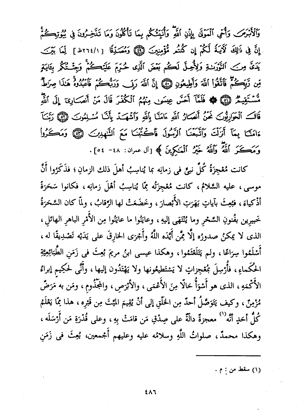 كَانَتْ مُعْجِزَةُ كُلِّ نَبِيٍّ فِي زَمَانِهِ بِمَا يُنَاسِبُ أَهْلَ ذَلِكَ الزَّمَانِ ; فَذَكَرُوا أَنَّ مُوسَى، عَلَيْهِ السَّلَامُ، كَانَتْ مُعْجِزَتُهُ مِمَّا يُنَاسِبُ أَهْلَ زَمَانِهِ، فَكَانُوا سَحَرَةً أَذْكِيَاءَ، فَبُعِثَ بِآيَاتٍ بَهَرَتِ الْأَبْصَارَ، وَخَضَعَتْ لَهَا الرِّقَابُ، وَلَمَّا كَانَ السَّحَرَةُ خَبِيرِينَ بِفُنُونِ السِّحْرِ وَمَا يَنْتَهِي إِلَيْهِ، وَعَايَنُوا مَا عَايَنُوا مِنَ الْأَمْرِ الْبَاهِرِ الْهَائِلِ، الَّذِي لَا يُمْكِنُ صُدُورُهُ إِلَّا مِمَّنْ أَيَّدَهُ اللَّهُ وَأَجْرَى الْخَارِقَ عَلَى يَدَيْهِ تَصْدِيقًا لَهُ، أَسْلَمُوا سِرَاعًا، وَلَمْ يَتَلَعْثَمُوا، وَهَكَذَا عِيسَى ابْنُ مَرْيَمَ، بُعِثَ فِي زَمَنِ الطَّبَائِعِيَّةِ الْحُكَمَاءِ، فَأُرْسِلَ بِمُعْجِزَاتٍ لَا يَسْتَطِيعُونَهَا وَلَا يَهْتَدُونَ إِلَيْهَا، وَأَنَّى لِحَكِيمٍ إِبْرَاءُ الْأَكْمَهِ، الَّذِي هُوَ أَسْوَأُ حَالًا مِنَ الْأَعْمَى وَالْأَبْرَصِ وَالْمَجْذُومِ، وَمَنْ بِهِ مَرَضٌ مُزْمِنٌ، وَكَيْفَ يَتَوَصَّلُ أَحَدٌ مِنَ الْخَلْقِ إِلَى أَنْ يُقِيمَ الْمَيِّتَ مِنْ قَبْرِهِ، هَذَا مِمَّا يَعْلَمُ كُلُّ أَحَدٍ أَنَّهُ مُعْجِزَةٌ دَالَّةٌ عَلَى صِدْقِ مَنْ قَامَتْ بِهِ، وَعَلَى قُدْرَةِ مَنْ أَرْسَلَهُ، وَهَكَذَا مُحَمَّدٌ، صَلَوَاتُ اللَّهِ وَسَلَامُهُ عَلَيْهِ وَعَلَيْهِمْ أَجْمَعِينَ، بُعِثَ فِي زَمَنِ
