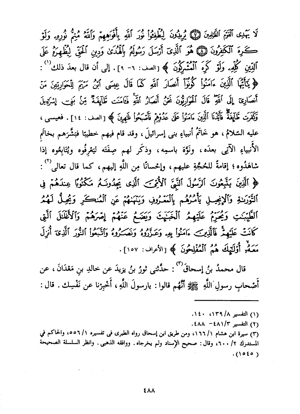 إِلَى أَنْ قَالَ بَعْدَ ذَلِكَ: {يَا أَيُّهَا الَّذِينَ آمَنُوا كُونُوا أَنْصَارَ اللَّهِ كَمَا قَالَ عِيسَى ابْنُ مَرْيَمَ لِلْحَوَارِيِّينَ مَنْ أَنْصَارِي إِلَى اللَّهِ قَالَ الْحَوَارِيُّونَ نَحْنُ أَنْصَارُ اللَّهِ فَآمَنَتْ طَائِفَةٌ مِنْ بَنِي إِسْرَائِيلَ وَكَفَرَتْ طَائِفَةٌ فَأَيَّدْنَا الَّذِينَ آمَنُوا عَلَى عَدُوِّهِمْ فَأَصْبَحُوا ظَاهِرِينَ} [الصف: 14] . فَعِيسَى، عَلَيْهِ السَّلَامُ، هُوَ خَاتَمُ أَنْبِيَاءِ بَنِي إِسْرَائِيلَ، وَقَدْ قَامَ فِيهِمْ خَطِيبًا فَبَشَّرَهُمْ بِخَاتَمِ الْأَنْبِيَاءِ الْآتِي بَعْدَهُ، وَنَوَّهَ بِاسْمِهِ، وَذَكَرَ لَهُمْ صِفَتَهُ لِيَعْرِفُوهُ وَيُتَابِعُوهُ إِذَا شَاهَدُوهُ ; إِقَامَةً لِلْحُجَّةِ عَلَيْهِمْ، وَإِحْسَانًا مِنَ اللَّهِ إِلَيْهِمْ، كَمَا قَالَ تَعَالَى: {الَّذِينَ يَتَّبِعُونَ الرَّسُولَ النَّبِيَّ الْأُمِّيَّ الَّذِي يَجِدُونَهُ مَكْتُوبًا عِنْدَهُمْ فِي التَّوْرَاةِ وَالْإِنْجِيلِ يَأْمُرُهُمْ بِالْمَعْرُوفِ وَيَنْهَاهُمْ عَنِ الْمُنْكَرِ وَيُحِلُّ لَهُمُ الطَّيِّبَاتِ وَيُحَرِّمُ عَلَيْهِمُ الْخَبَائِثَ وَيَضَعُ عَنْهُمْ إِصْرَهُمْ وَالْأَغْلَالَ الَّتِي كَانَتْ عَلَيْهِمْ فَالَّذِينَ آمَنُوا بِهِ وَعَزَّرُوهُ وَنَصَرُوهُ وَاتَّبَعُوا النُّورَ الَّذِي أُنْزِلَ مَعَهُ أُولَئِكَ هُمُ الْمُفْلِحُونَ} [الأعراف: 157] .