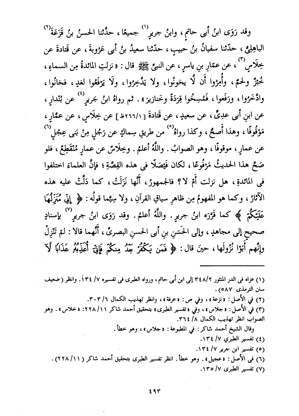 وَقَدْ رَوَى ابْنُ أَبِي حَاتِمٍ، وَابْنُ جَرِيرٍ جَمِيعًا، حَدَّثَنَا الْحَسَنُ بْنُ قَزَعَةَ الْبَاهِلِيُّ حَدَّثَنَا سُفْيَانُ بْنُ حَبِيبٍ، حَدَّثَنَا سَعِيدُ بْنُ أَبِي عَرُوبَةَ، عَنْ قَتَادَةَ عَنْ، خِلَاسٍ، عَنْ عَمَّارِ بْنِ يَاسِرٍ، عَنِ النَّبِيِّ صَلَّى اللَّهُ عَلَيْهِ وَسَلَّمَ قَالَ: «نَزَلَتِ الْمَائِدَةُ مِنَ السَّمَاءِ خُبْزٌ وَلَحْمٌ، وَأُمِرُوا أَنْ لَا يَخُونُوا، وَلَا يَدَّخِرُوا، وَلَا يَرْفَعُوا لِغَدٍ، فَخَانُوا وَادَّخَرُوا وَرَفَعُوا، فَمُسِخُوا قِرَدَةً وَخَنَازِيرَ» ثُمَّ رَوَاهُ ابْنُ جَرِيرٍ عَنْ بُنْدَارٍ، عَنِ ابْنِ أَبِي عَدِيٍّ، عَنْ سَعِيدٍ، عَنْ قَتَادَةَ، عَنْ خِلَاسٍ، عَنْ عَمَّارٍ، مَوْقُوفًا، وَهَذَا أَصَحُّ، وَكَذَا رَوَاهُ مِنْ طَرِيقِ سِمَاكٍ عَنْ رَجُلٍ مِنْ بَنِي عِجْلٍ، عَنْ عَمَّارٍ مَوْقُوفًا، وَهُوَ الصَّوَابُ. وَاللَّهُ أَعْلَمُ. وَخِلَاسٌ عَنْ عَمَّارٍ مُنْقَطِعٌ، فَلَوْ صَحَّ هَذَا الْحَدِيثُ مَرْفُوعًا لَكَانَ فَيْصَلًا فِي هَذِهِ الْقِصَّةِ ; فَإِنَّ الْعُلَمَاءَ اخْتَلَفُوا فِي الْمَائِدَةِ، هَلْ نَزَلَتْ أَمْ لَا؟ فَالْجُمْهُورُ أَنَّهَا نَزَلَتْ، كَمَا دَلَّتْ عَلَيْهِ هَذِهِ الْآثَارُ، وَكَمَا هُوَ الْمَفْهُومُ مِنْ ظَاهِرِ سِيَاقِ الْقُرْآنِ، وَلَا سِيَّمَا قَوْلُهُ: {إِنِّي مُنَزِّلُهَا عَلَيْكُمْ} [المائدة: 115] كَمَا قَرَّرَهُ ابْنُ جَرِيرٍ. وَاللَّهُ أَعْلَمُ. وَقَدْ رَوَى ابْنُ جَرِيرٍ بِإِسْنَادٍ صَحِيحٍ إِلَى مُجَاهِدٍ، وَإِلَى الْحَسَنِ بْنِ أَبِي الْحَسَنِ الْبَصْرِيِّ، أَنَّهُمَا قَالَا: لَمْ تَنْزِلْ. وَإِنَّهُمْ أَبَوْا نُزُولَهَا، حِينَ قَالَ: {فَمَنْ يَكْفُرْ بَعْدُ مِنْكُمْ فَإِنِّي أُعَذِّبُهُ عَذَابًا لَا أُعَذِّبُهُ أَحَدًا مِنَ الْعَالَمِينَ} [المائدة: 115]