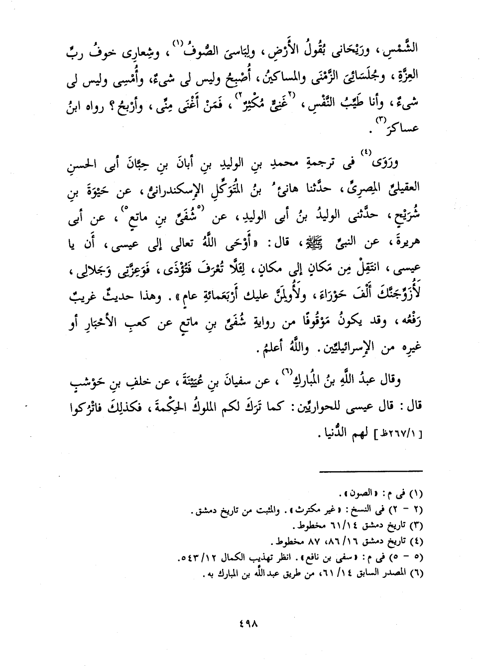 وَقَالَ عَبْدُ اللَّهِ بْنُ الْمُبَارَكِ، عَنْ سُفْيَانَ بْنِ عُيَيْنَةَ، عَنْ خَلَفِ بْنِ حَوْشَبٍ قَالَ: قَالَ عِيسَى لِلْحَوَارِيِّينَ: كَمَا تَرَكَ لَكُمُ الْمُلُوكَ الْحِكْمَةَ، فَكَذَلِكَ فَاتْرُكُوا لَهُمُ الدُّنْيَا.