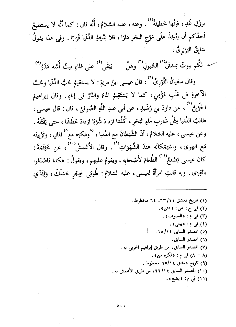 وَقَالَ سُفْيَانُ الثَّوْرِيُّ: قَالَ عِيسَى ابْنُ مَرْيَمَ: لَا يَسْتَقِيمُ حُبُّ الدُّنْيَا وَحُبُّ الْآخِرَةِ فِي قَلْبِ مُؤْمِنٍ، كَمَا لَا يَسْتَقِيمُ الْمَاءُ وَالنَّارُ فِي إِنَاءٍ. وَقَالَ إِبْرَاهِيمُ الْحَرْبِيُّ، عَنْ دَاوُدَ بْنِ رَشِيدٍ، عَنْ أَبِي عَبْدِ اللَّهِ الصُّوفِيِّ، قَالَ: قَالَ عِيسَى: طَالِبُ الدُّنْيَا مِثْلُ شَارِبِ مَاءِ الْبَحْرِ، كُلَّمَا ازْدَادَ شُرْبًا ازْدَادَ عَطَشًا، حَتَّى يَقْتُلَهُ. وَعَنْ عِيسَى، عَلَيْهِ السَّلَامُ، أَنَّ الشَّيْطَانَ مَعَ الدُّنْيَا، وَمَكْرَهُ مَعَ الْمَالِ، وَتَزْيِينَهُ مَعَ الْهَوَى، وَاسْتِمْكَانَهُ عِنْدَ الشَّهَوَاتِ. وَقَالَ الْأَعْمَشُ، عَنْ خَيْثَمَةَ: كَانَ عِيسَى يَصْنَعُ الطَّعَامَ لِأَصْحَابِهِ وَيَقُومُ عَلَيْهِمْ، وَيَقُولُ: هَكَذَا فَاصْنَعُوا بِالْقِرَى. وَبِهِ: قَالَتِ امْرَأَةٌ لِعِيسَى، عَلَيْهِ السَّلَامُ: طُوبَى لِحِجْرٍ حَمَلَكَ، وَلِثَدْيٍ