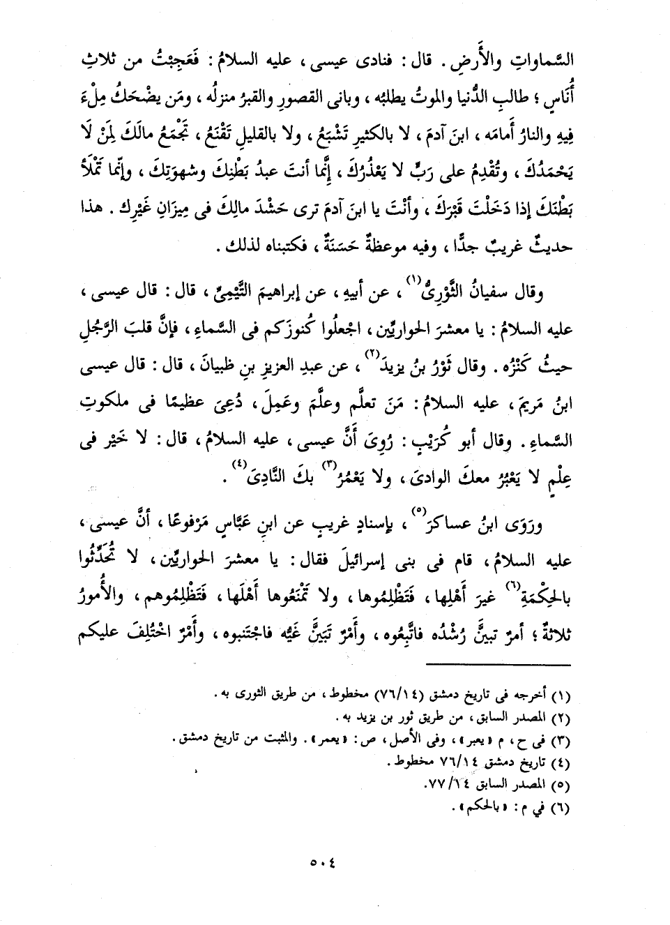 وَرَوَى ابْنُ عَسَاكِرَ، بِإِسْنَادٍ غَرِيبٍ عَنِ ابْنِ عَبَّاسٍ مَرْفُوعًا، «أَنَّ عِيسَى، عَلَيْهِ السَّلَامُ، قَامَ فِي بَنِي إِسْرَائِيلَ فَقَالَ: يَا مَعْشَرَ الْحَوَارِيِّينَ، لَا تُحَدِّثُوا بِالْحِكْمَةِ غَيْرَ أَهْلِهَا فَتَظْلِمُوهَا، وَلَا تَمْنَعُوهَا أَهْلَهَا، فَتَظْلِمُوهُمْ، وَالْأُمُورُ ثَلَاثَةٌ: أَمْرٌ تَبَيَّنَ رُشْدُهُ فَاتَّبِعُوهُ، وَأَمْرٌ تَبَيَّنَ غَيُّهُ فَاجْتَنِبُوهُ، وَأَمْرٌ اخْتُلِفَ عَلَيْكُمْ.»