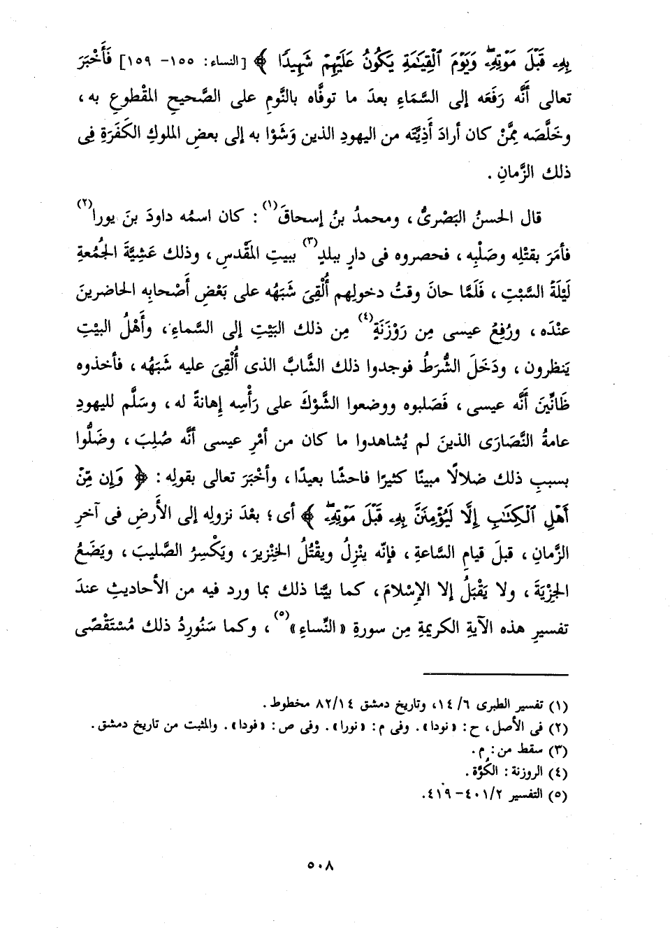 قَالَ الْحَسَنُ الْبَصْرِيُّ، وَمُحَمَّدُ بْنُ إِسْحَاقَ: كَانَ اسْمُهُ دَاوُدَ بْنَ يُورَا فَأَمَرَ بِقَتْلِهِ وَصَلْبِهِ فَحَصَرُوهُ فِي دَارٍ بِبَيْتِ الْمَقْدِسِ، وَذَلِكَ عَشِيَّةَ الْجُمُعَةِ لَيْلَةَ السَّبْتِ، فَلَمَّا حَانَ وَقْتُ دُخُولِهِمْ أُلْقِيَ شَبَهُهُ عَلَى بَعْضِ أَصْحَابِهِ الْحَاضِرِينَ عِنْدَهُ، وَرُفِعَ عِيسَى مِنْ رَوْزَنَةٍ مِنْ ذَلِكَ الْبَيْتِ إِلَى السَّمَاءِ، وَأَهْلُ الْبَيْتِ يَنْظُرُونَ، وَدَخَلَ الشُّرَطُ فَوَجَدُوا ذَلِكَ الشَّابَّ الَّذِي أُلْقِيَ عَلَيْهِ شَبَهُهُ، فَأَخَذُوهُ ظَانِّينَ أَنَّهُ عِيسَى، فَصَلَبُوهُ وَوَضَعُوا الشَّوْكَ عَلَى رَأْسِهِ إِهَانَةً لَهُ، وَسَلَّمَ لِلْيَهُودِ عَامَّةُ النَّصَارَى الَّذِينَ لَمْ يُشَاهِدُوا مَا كَانَ مِنْ أَمْرِ عِيسَى أَنَّهُ صُلِبَ، وَضَلُّوا بِسَبَبِ ذَلِكَ ضَلَالًا مُبِينًا كَثِيرًا فَاحِشًا بَعِيدًا، وَأَخْبَرَ تَعَالَى بِقَوْلِهِ: {وَإِنْ مِنْ أَهْلِ الْكِتَابِ إِلَّا لَيُؤْمِنَنَّ بِهِ قَبْلَ مَوْتِهِ} [النساء: 159] أَيْ: بَعْدَ نُزُولِهِ إِلَى الْأَرْضِ فِي آخِرِ الزَّمَانِ، قَبْلَ قِيَامِ السَّاعَةِ، فَإِنَّهُ يَنْزِلُ وَيَقْتُلُ الْخِنْزِيرَ، وَيَكْسِرُ الصَّلِيبَ وَيَضَعُ الْجِزْيَةَ، وَلَا يَقْبَلُ إِلَّا الْإِسْلَامَ، كَمَا بَيَّنَّا ذَلِكَ بِمَا وَرَدَ فِيهِ مِنَ الْأَحَادِيثِ عِنْدَ تَفْسِيرِ هَذِهِ الْآيَةِ الْكَرِيمَةِ مِنْ سُورَةِ " النِّسَاءِ " وَكَمَا سَنُورِدُ ذَلِكَ مُسْتَقْصًى