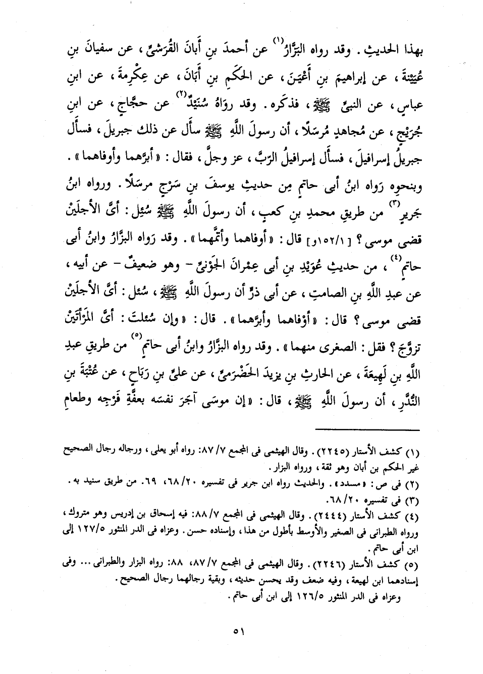 بِهَذَا الْحَدِيثِ. وَقَدْ رَوَاهُ الْبَزَّارُ عَنْ أَحْمَدَ بْنِ أَبَانٍ الْقُرَشِيِّ، عَنْ سُفْيَانَ بْنِ عُيَيْنَةَ، عَنْ إِبْرَاهِيمَ بْنِ أَعْيَنَ، عَنِ الْحَكَمِ بْنِ أَبَانٍ، عَنْ عِكْرِمَةَ، عَنِ ابْنِ عَبَّاسٍ، عَنِ النَّبِيِّ صَلَّى اللَّهُ عَلَيْهِ وَسَلَّمَ فَذَكَرَهُ. وَقَدْ رَوَاهُ سُنَيْدٌ عَنْ حَجَّاجٍ، عَنِ ابْنِ جُرَيْجٍ عَنْ مُجَاهِدٍ مُرْسَلًا، «أَنَّ رَسُولَ اللَّهِ صَلَّى اللَّهُ عَلَيْهِ وَسَلَّمَ سَأَلَ عَنْ ذَلِكَ جِبْرِيلَ، فَسَأَلَ جِبْرِيلُ إِسْرَافِيلَ، فَسَأَلَ إِسْرَافِيلُ الرَّبَّ، عَزَّ وَجَلَّ، فَقَالَ: أَبَرَّهُمَا وَأَوْفَاهُمَا» وَبِنَحْوِهِ رَوَاهُ ابْنُ أَبِي حَاتِمٍ مِنْ حَدِيثِ يُوسُفَ بْنِ سَرْجٍ مُرْسَلًا. وَرَوَاهُ ابْنُ جَرِيرٍ مِنْ طَرِيقِ مُحَمَّدِ بْنِ كَعْبٍ، «أَنَّ رَسُولَ اللَّهِ صَلَّى اللَّهُ عَلَيْهِ وَسَلَّمَ سُئِلَ: أَيَّ الْأَجَلَيْنِ قَضَى مُوسَى؟ قَالَ: أَوْفَاهُمَا وَأَتَمَّهُمَا» . وَقَدْ رَوَاهُ الْبَزَّارُ وَابْنُ أَبِي حَاتِمٍ، مِنْ حَدِيثِ عُوَيْدِ بْنِ أَبِي عِمْرَانَ الْجَوْنَيِّ - وَهُوَ ضَعِيفٌ - عَنْ أَبِيهِ، عَنْ عَبْدِ اللَّهِ بْنِ الصَّامِتِ، عَنْ أَبِي ذَرٍّ «أَنَّ رَسُولَ اللَّهِ صَلَّى اللَّهُ عَلَيْهِ وَسَلَّمَ، سُئِلَ: أَيَّ الْأَجَلَيْنِ قَضَى مُوسَى؟ قَالَ: أَوْفَاهُمَا وَأَبَرَّهُمَا» . قَالَ: «وَإِنْ سُئِلَ: أَيَّ الْمَرْأَتَيْنِ تَزَوَّجَ؟ فَقُلِ: الصُّغْرَى مِنْهُمَا» وَقَدْ رَوَاهُ الْبَزَّارُ وَابْنُ أَبِي حَاتِمٍ مِنْ طَرِيقِ عَبْدِ اللَّهِ بْنِ لَهِيعَةَ، عَنِ الْحَارِثِ بْنِ يَزِيدَ الْحَضْرَمِيِّ، عَنْ عَلِيِّ بْنِ رَبَاحٍ، عَنْ عُتْبَةَ بْنِ النُّدَّرِ، «أَنَّ رَسُولَ اللَّهِ صَلَّى اللَّهُ عَلَيْهِ وَسَلَّمَ، قَالَ: إِنَّ مُوسَى آجَرَ نَفْسَهُ بِعِفَّةِ فَرْجِهِ وَطَعَامِ