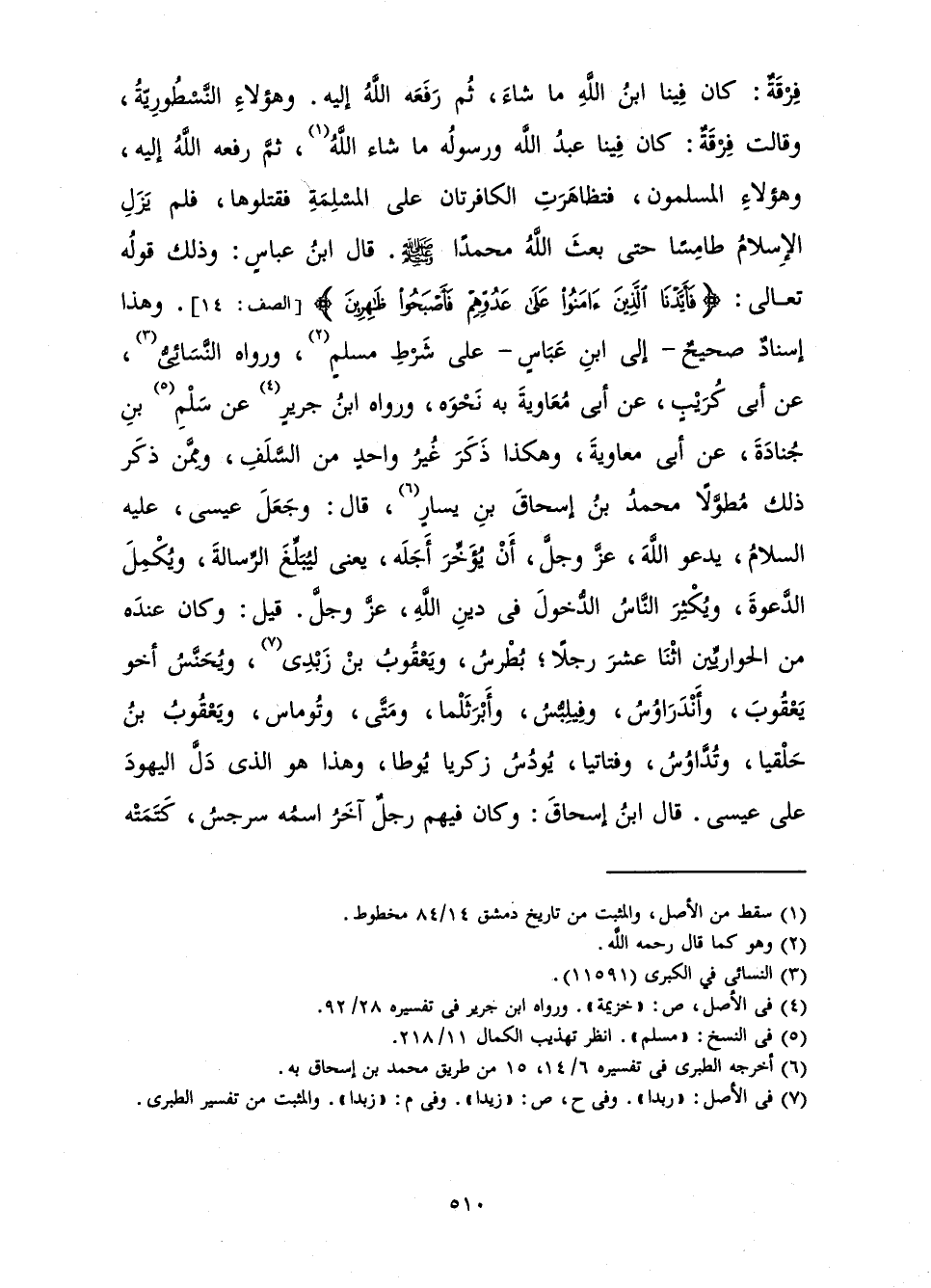 فِرْقَةٌ: كَانَ فِينَا ابْنُ اللَّهِ مَا شَاءَ، ثُمَّ رَفَعَهُ اللَّهُ إِلَيْهِ. وَهَؤُلَاءِ النَّسْطُورِيَّةُ، وَقَالَتْ فِرْقَةٌ: كَانَ فِينَا عَبْدُ اللَّهِ وَرَسُولُهُ مَا شَاءَ اللَّهُ، ثُمَّ رَفَعَهُ اللَّهُ إِلَيْهِ، وَهَؤُلَاءِ الْمُسْلِمُونَ، فَتَظَاهَرَتِ الْكَافِرَتَانِ عَلَى الْمُسْلِمَةِ فَقَتَلُوهَا، فَلَمْ يَزَلِ الْإِسْلَامُ طَامِسًا حَتَّى بَعَثَ اللَّهُ مُحَمَّدًا صَلَّى اللَّهُ عَلَيْهِ وَسَلَّمَ. قَالَ ابْنُ عَبَّاسٍ: وَذَلِكَ قَوْلُهُ تَعَالَى: {فَأَيَّدْنَا الَّذِينَ آمَنُوا عَلَى عَدُوِّهِمْ فَأَصْبَحُوا ظَاهِرِينَ} [الصف: 14] . وَهَذَا إِسْنَادٌ صَحِيحٌ - إِلَى ابْنُ عَبَّاسٍ - عَلَى شَرْطِ مُسْلِمٍ، وَرَوَاهُ النَّسَائِيُّ، عَنْ أَبِي كُرَيْبٍ، عَنْ أَبِي مُعَاوِيَةَ بِهِ نَحْوَهُ، وَرَوَاهُ ابْنُ جَرِيرٍ عَنْ سَلْمِ بْنِ جُنَادَةَ، عَنْ أَبِي مُعَاوِيَةَ، وَهَكَذَا ذَكَرَ غَيْرُ وَاحِدٍ مِنَ السَّلَفِ، وَمِمَّنْ ذَكَرَ ذَلِكَ مُطَوَّلًا مُحَمَّدُ بْنُ إِسْحَاقَ بْنِ يَسَارٍ، قَالَ: وَجَعَلَ عِيسَى، عَلَيْهِ السَّلَامُ، يَدْعُو اللَّهُ، عَزَّ وَجَلَّ، أَنْ يُؤَخِّرَ أَجَلَهُ، يَعْنِي لِيُبَلِّغَ الرِّسَالَةَ، وَيُكْمِلَ الدَّعْوَةَ، وَيُكْثِرَ النَّاسُ الدُّخُولَ فِي دِينِ اللَّهِ، عَزَّ وَجَلَّ. قِيلَ: وَكَانَ عِنْدَهُ مِنَ الْحَوَارِيِّينَ اثْنَا عَشَرَ رَجُلًا ; بُطْرُسُ، وَيَعْقُوبُ بْنُ زَبْدِي، وَيَحْنَسُ أَخُو يَعْقُوبَ، وَأَنْدَرَاوِسُ، وَفِلِيبُّسُ، وَأَبْرَثَلْمَا، وَمَتَّى، وَتُومَاسُ، وَيَعْقُوبُ بْنُ حَلْقِيَا، وَتُدَّاوُسُ، وَفَتَاتْيَا، يُودُسُ زَكَرِيَّا يَوُطَا، وَهَذَا هُوَ الَّذِي دَلَّ الْيَهُودَ عَلَى عِيسَى. قَالَ ابْنُ إِسْحَاقَ وَكَانَ فِيهِمْ رَجُلٌ آخَرُ اسْمُهُ سَرْجَسُ، كَتَمَتْهُ
