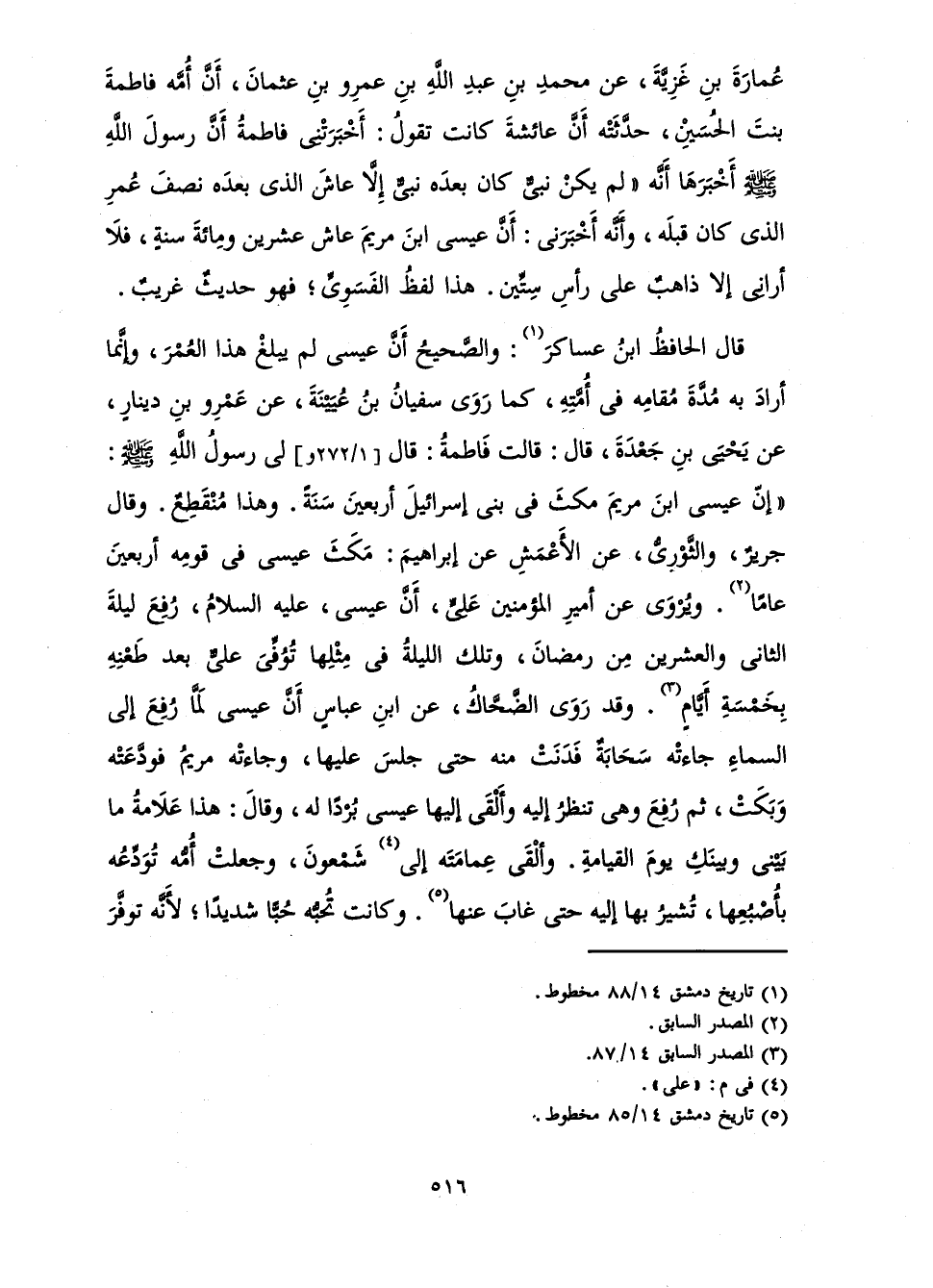 قَالَ الْحَافِظُ بْنُ عَسَاكِرَ: وَالصَّحِيحُ أَنَّ عِيسَى لَمْ يَبْلُغْ هَذَا الْعُمْرَ، وَإِنَّمَا أَرَادَ بِهِ مُدَّةَ مَقَامِهِ فِي أُمَّتِهِ، كَمَا رَوَى سُفْيَانُ بْنُ عُيَيْنَةَ، عَنْ عَمْرِو بْنِ دِينَارٍ، عَنْ يَحْيَى بْنِ جَعْدَةَ، قَالَ: قَالَتْ فَاطِمَةُ: «قَالَ لِي رَسُولُ اللَّهِ صَلَّى اللَّهُ عَلَيْهِ وَسَلَّمَ: إِنَّ عِيسَى ابْنَ مَرْيَمَ مَكَثَ فِي بَنِي إِسْرَائِيلَ أَرْبَعِينَ سَنَةً» وَهَذَا مُنْقَطِعٌ. وَقَالَ جَرِيرٌ، وَالثَّوْرِيُّ، عَنِ الْأَعْمَشِ عَنْ إِبْرَاهِيمَ: مَكَثَ عِيسَى فِي قَوْمِهِ أَرْبَعِينَ عَامًا. وَيُرْوَى عَنْ أَمِيرِ الْمُؤْمِنِينَ عَلِيٍّ، أَنَّ عِيسَى، عَلَيْهِ السَّلَامُ، رُفِعَ لَيْلَةَ الثَّانِي وَالْعِشْرِينَ مِنْ رَمَضَانَ، وَتِلْكَ اللَّيْلَةُ فِي مِثْلِهَا تُوُفِّيَ عَلِيٌّ بَعْدَ طَعْنِهِ بِخَمْسَةِ أَيَّامٍ. وَقَدْ رَوَى الضَّحَّاكُ، عَنِ ابْنِ عَبَّاسٍ أَنَّ عِيسَى لَمَّا رَفَعَ إِلَى السَّمَاءِ جَاءَتْهُ سَحَابَةٌ فَدَنَتْ مِنْهُ حَتَّى جَلَسَ عَلَيْهَا، وَجَاءَتْهُ مَرْيَمُ فَوَدَّعَتْهُ وَبَكَتْ، ثُمَّ رُفِعَ وَهِيَ تَنْظُرُ إِلَيْهِ وَأَلْقَى إِلَيْهَا عِيسَى بُرْدًا لَهُ وَقَالَ: هَذَا عَلَامَةُ مَا بَيْنِي وَبَيْنَكِ يَوْمَ الْقِيَامَةِ. وَأَلْقَى عِمَامَتَهُ إِلَى شَمْعُونَ، وَجَعَلَتْ أُمُّهُ تُوَدِّعُهُ بِأُصْبُعِهَا، تُشِيرُ بِهَا إِلَيْهِ حَتَّى غَابَ عَنْهَا. وَكَانَتْ تُحِبُّهُ حُبًّا شَدِيدًا ; لِأَنَّهُ تَوَفَّرَ