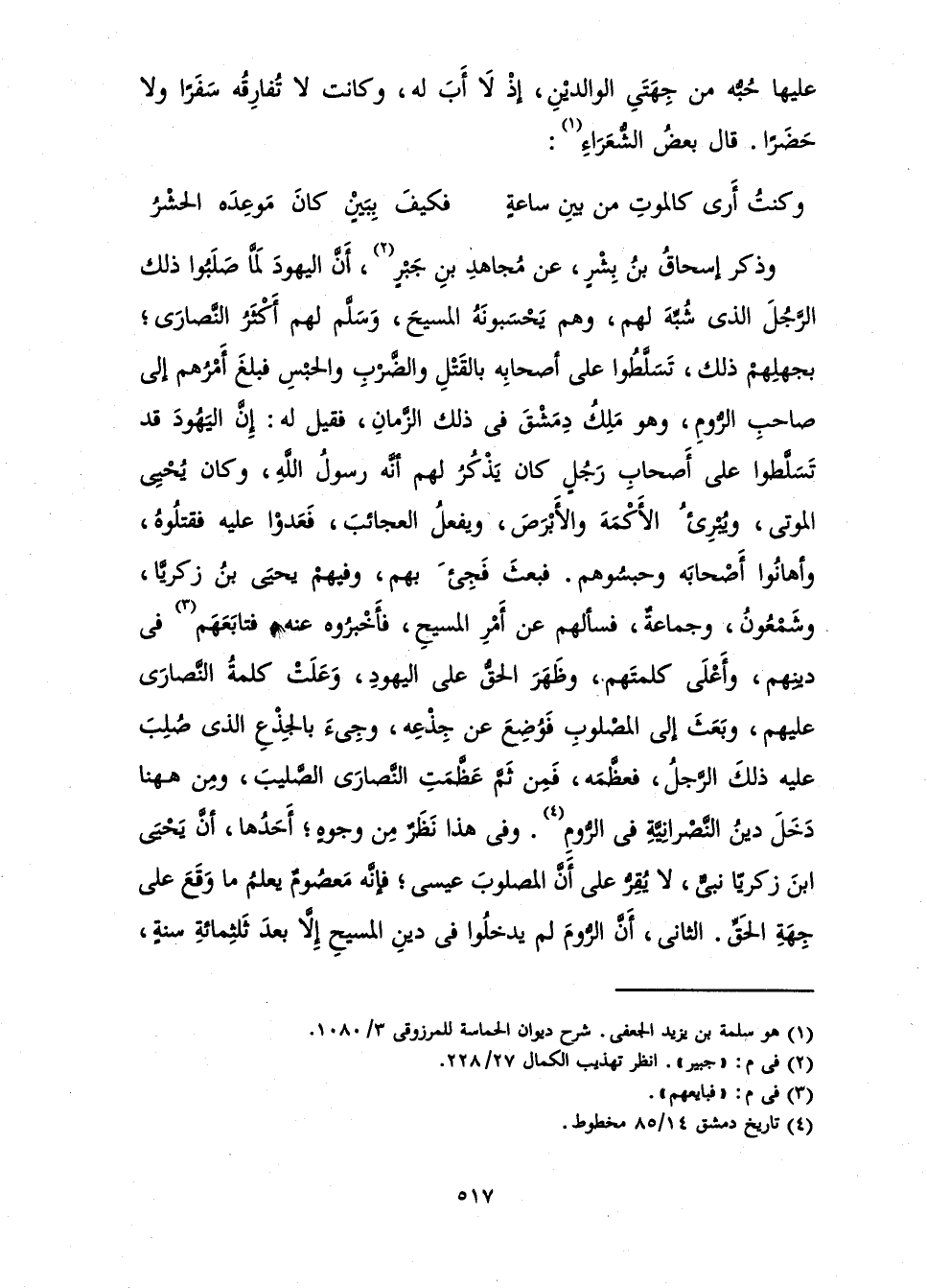 وَذَكَرَ إِسْحَاقُ بْنُ بِشْرٍ عَنْ مُجَاهِدِ بْنِ جَبْرٍ، أَنَّ الْيَهُودَ لَمَّا صَلَبُوا ذَلِكَ الرَّجُلَ الَّذِي شُبِّهَ لَهُمْ، وَهُمْ يَحْسَبُونَهُ الْمَسِيحَ، وَسَلَّمَ لَهُمْ أَكْثَرُ النَّصَارَى ; بِجَهْلِهِمْ ذَلِكَ، تَسَلَّطُوا عَلَى أَصْحَابِهِ بِالْقَتْلِ وَالضَّرْبِ وَالْحَبْسِ فَبَلَغَ أَمْرُهُمْ إِلَى صَاحِبِ الرُّومِ، وَهُوَ مَلِكُ دِمَشْقَ فِي ذَلِكَ الزَّمَانِ، فَقِيلَ لَهُ: إِنَّ الْيَهُودَ قَدْ تَسَلَّطُوا عَلَى أَصْحَابِ رَجُلٍ كَانَ يَذْكُرُ لَهُمْ أَنَّهُ رَسُولُ اللَّهِ، وَكَانَ يُحْيِي الْمَوْتَى، وَيُبْرِئُ الْأَكْمَهَ وَالْأَبْرَصَ، وَيَفْعَلُ الْعَجَائِبَ، فَعَدَوْا عَلَيْهِ فَقَتَلُوهُ، وَأَهَانُوا أَصْحَابَهُ وَحَبَسُوهُمْ. فَبَعَثَ فَجِيءَ بِهِمْ وَفِيهِمْ يَحْيَى بْنُ زَكَرِيَّا، وَشَمْعُونُ، وَجَمَاعَةٌ، فَسَأَلَهُمْ عَنْ أَمْرِ الْمَسِيحِ، فَأَخْبَرُوهُ عَنْهُ فتَابَعَهُمْ فِي دِينِهِمْ وَأَعْلَى كَلِمَتَهُمْ، وَظَهَرَ الْحَقُّ عَلَى الْيَهُودِ، وَعَلَتْ كَلِمَةُ النَّصَارَى عَلَيْهِمْ، وَبَعَثَ إِلَى الْمَصْلُوبِ فَوُضِعَ عَنْ جِذْعِهِ، وَجِيءَ بِالْجِذْعِ الَّذِي صُلِبَ عَلَيْهِ ذَلِكَ الرَّجُلُ فَعَظَّمَهُ، فَمِنْ ثَمَّ عَظَّمَتِ النَّصَارَى الصَّلِيبَ، وَمِنْ هَاهُنَا دَخَلَ دِينُ النَّصْرَانِيَّةِ فِي الرُّومِ. وَفِي هَذَا نَظَرٌ مِنْ وُجُوهٍ ; أَحَدُهَا، أَنَّ يَحْيَى بْنَ زَكَرِيَّا نَبِيٌّ، لَا يُقِرُّ عَلَى أَنَّ الْمَصْلُوبَ عِيسَى ; فَإِنَّهُ مَعْصُومٌ يَعْلَمُ مَا وَقَعَ عَلَى جِهَةِ الْحَقِّ. الثَّانِي، أَنَّ الرُّومَ لَمْ يَدْخُلُوا فِي دِينِ الْمَسِيحِ إِلَّا بَعْدَ ثَلَاثِمِائَةِ سَنَةٍ،