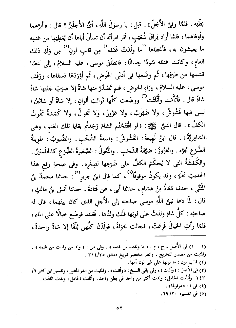 بَطْنِهِ. فَلَمَّا وَفَّى الْأَجَلَ. قِيلَ: يَا رَسُولَ اللَّهِ، أَيَّ الْأَجَلَيْنِ؟ قَالَ: أَبَرَّهُمَا وَأَوْفَاهُمَا، فَلَمَّا أَرَادَ فِرَاقَ شُعَيْبٍ، أَمَرَ امْرَأَتَهُ أَنْ تَسْأَلَ أَبَاهَا أَنْ يُعْطِيَهَا مِنْ غَنَمِهِ مَا يَعِيشُونَ بِهِ، فَأَعْطَاهَا مَا وَلَدَتْ غَنَمُهُ مِنْ قَالِبِ لَوْنٍ مِنْ وَلَدِ ذَلِكَ الْعَامِ، وَكَانَتْ غَنَمُهُ سُودًا حِسَانًا، فَانْطَلَقَ مُوسَى، عَلَيْهِ السَّلَامُ، إِلَى عَصًا قَسَمَهَا مِنْ طَرَفِهَا، ثُمَّ وَضَعَهَا فِي أَدْنَى الْحَوْضِ، ثُمَّ أَوْرَدَهَا فَسَقَاهَا، وَوَقَفَ مُوسَى، عَلَيْهِ السَّلَامُ، بِإِزَاءِ الْحَوْضِ، فَلَمْ تَصْدُرْ مِنْهَا شَاةٌ إِلَّا ضَرَبَ جَنْبَهَا شَاةً شَاةً قَالَ: فَأَتْأَمَتْ وَأَثْلَثَتْ وَوَضَعَتْ كُلُّهَا قَوَالِبَ أَلْوَانٍ، إِلَّا شَاةً أَوْ شَاتَيْنِ; لَيْسَ فِيهَا فَشُوشٌ، وَلَا ضَبُوبٌ، وَلَا عَزُوزٌ، وَلَا ثَعُولٌ، وَلَا كَمْشَةٌ تَفُوتُ الْكَفَّ. قَالَ النَّبِيُّ صَلَّى اللَّهُ عَلَيْهِ وَسَلَّمَ: لَوِ افْتَتَحْتُمُ الشَّامَ وَجَدْتُمْ بَقَايَا تِلْكَ الْغَنَمِ، وَهِيَ السَّامِرِيَّةُ» قَالَ ابْنُ لَهِيعَةَ: الْفَشُوشُ: وَاسِعَةُ الشَّخْبِ. وَالضَّبُوبُ: طَوِيلَةُ الضَّرْعِ تَجُرُّهُ. وَالْعَزُوزُ: ضَيِّقَةُ الشَّخْبِ. وَالثَّعُولُ: الصَّغِيرَةُ الضَّرْعِ كَالْحَلَمَتَيْنِ. وَالْكَمْشَةُ الَّتِي لَا يُحْكَمُ الْكَفُّ عَلَى ضَرْعِهَا لِصِغَرِهِ. وَفِي صِحَّةِ رَفْعِ هَذَا الْحَدِيثِ نَظَرٌ، وَقَدْ يَكُونُ مَوْقُوفًا، كَمَا قَالَ ابْنُ جَرِيرٍ: حَدَّثَنَا مُحَمَّدُ بْنُ الْمُثَنَّى، حَدَّثَنَا مُعَاذُ بْنُ هِشَامٍ، حَدَّثَنَا أَبِي، عَنْ قَتَادَةَ، حَدَّثَنَا أَنَسُ بْنُ مَالِكٍ قَالَ: لَمَّا دَعَا نَبِيُّ اللَّهِ مُوسَى صَاحِبَهُ إِلَى الْأَجَلِ الَّذِي كَانَ بَيْنَهُمَا، قَالَ لَهُ صَاحِبُهُ: كُلُّ شَاةٍ وَلَدَتْ عَلَى لَوْنِهَا فَلَكَ وَلَدُهَا. فَعَمَدَ فَوَضَعَ خَيَالًا عَلَى الْمَاءِ، فَلَمَّا رَأَتِ الْخَيَالَ فَزِعَتْ، فَجَالَتْ جَوْلَةً، فَوَلَدْنَ كُلُّهُنَّ بُلْقًا إِلَّا شَاةً وَاحِدَةً،