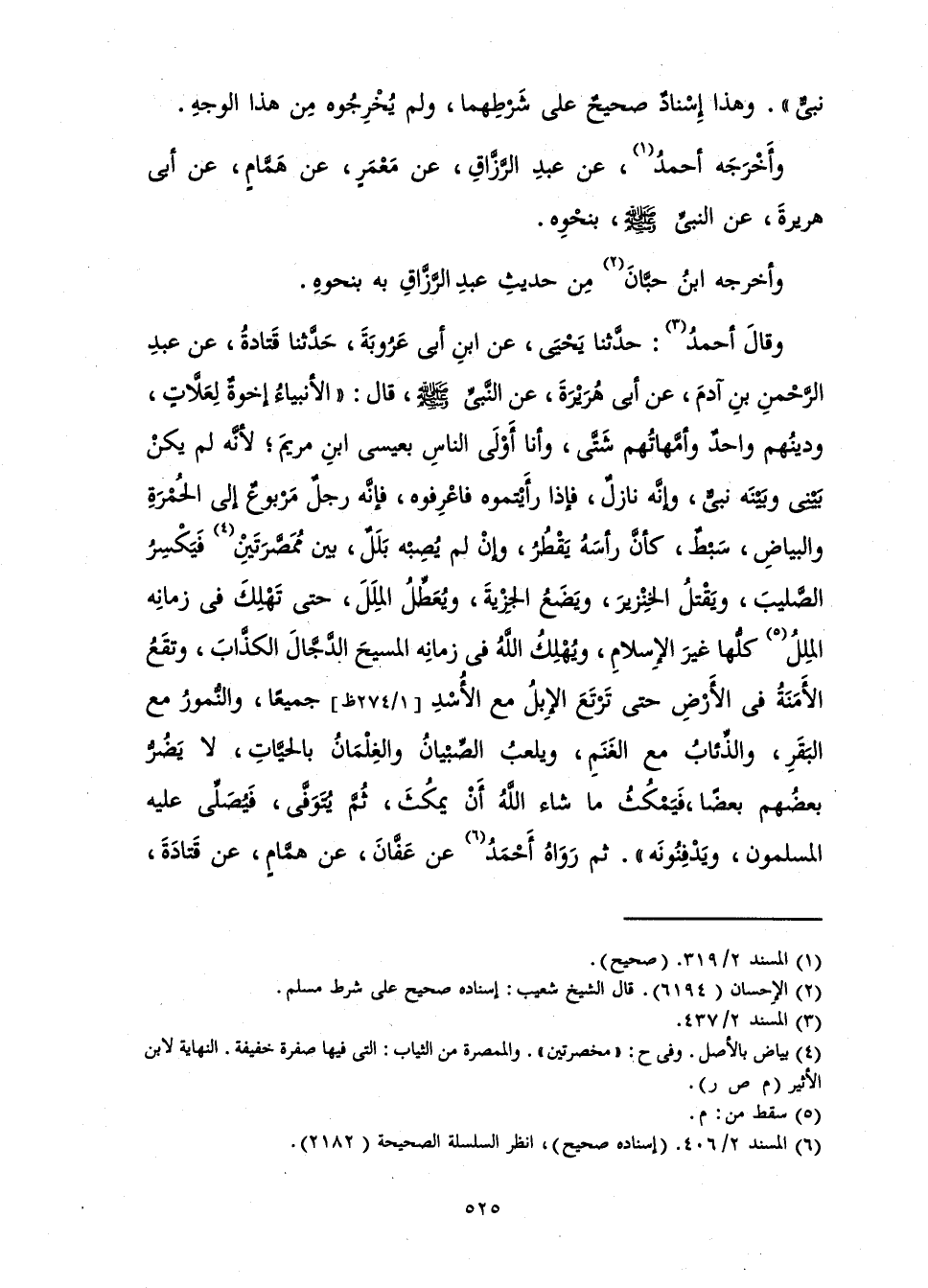 وَقَالَ أَحْمَدُ: حَدَّثَنَا يَحْيَى، عَنِ ابْنِ أَبِي عَرُوبَةَ، حَدَّثَنَا قَتَادَةُ، عَنْ عَبْدِ الرَّحْمَنِ بْنِ آدَمَ، عَنْ أَبِي هُرَيْرَةَ، عَنِ النَّبِيِّ صَلَّى اللَّهُ عَلَيْهِ وَسَلَّمَ، قَالَ: «الْأَنْبِيَاءُ إِخْوَةٌ لَعَلَّاتٍ، وَدِينُهُمْ وَاحِدٌ وَأُمَّهَاتُهُمْ شَتَّى، وَأَنَا أَوْلَى النَّاسِ بِعِيسَى ابْنِ مَرْيَمَ ; لِأَنَّهُ لَمْ يَكُنْ بَيْنِي وَبَيْنَهُ نَبِيٌّ، وَإِنَّهُ نَازِلٌ، فَإِذَا رَأَيْتُمُوهُ فَاعْرِفُوهُ، فَإِنَّهُ رَجُلٌ مَرْبُوعٌ إِلَى الْحُمْرَةِ وَالْبَيَاضِ، سَبْطٌ كَأَنَّ رَأْسَهُ يَقْطُرُ، وَإِنْ لَمْ يُصِبْهُ بَلَلٌ، بَيْنَ مُمَصَّرَتَيْنِ، فَيَكْسِرُ الصَّلِيبَ، وَيَقْتُلُ الْخِنْزِيرَ، وَيَضَعُ الْجِزْيَةَ، وَيُعَطِّلُ الْمِلَلَ، حَتَّى تَهْلِكَ فِي زَمَانِهِ الْمِلَلُ كُلُّهَا غَيْرَ الْإِسْلَامِ، وَيُهْلِكُ اللَّهُ فِي زَمَانِهِ الْمَسِيحَ الدَّجَّالَ الْكَذَّابَ، وَتَقَعُ الْأَمَنَةُ فِي الْأَرْضِ حَتَّى تَرْتَعَ الْإِبِلُ مَعَ الْأُسْدِ جَمِيعًا، وَالنُّمُورُ مَعَ الْبَقَرِ، وَالذِّئَابُ مَعَ الْغَنَمِ، وَيَلْعَبُ الصِّبْيَانُ وَالْغِلْمَانُ بِالْحَيَّاتِ، لَا يَضُرُّ بَعْضُهُمْ بَعْضًا، فَيَمْكُثُ مَا شَاءَ اللَّهُ أَنْ يَمْكُثَ، ثُمَّ يَتَوَفَّى، فَيُصَلِّي عَلَيْهِ الْمُسْلِمُونَ وَيَدْفِنُونَهُ» ثُمَّ رَوَاهُ أَحْمَدُ، عَنْ عَفَّانَ، عَنْ هَمَّامٍ، عَنْ قَتَادَةَ،