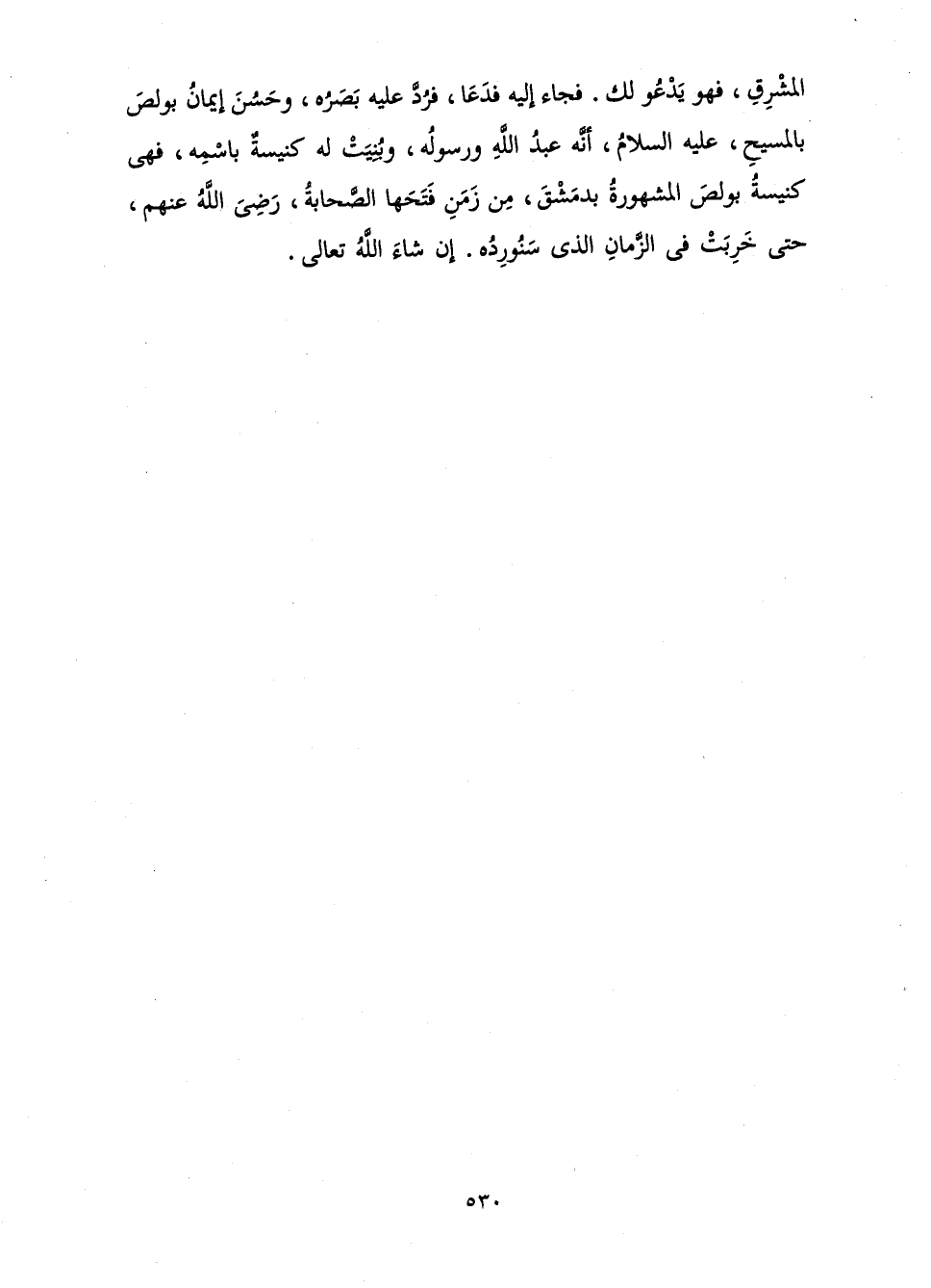 الْمَشْرِقِ، فَهُوَ يَدْعُو لَكَ. فَجَاءَ إِلَيْهِ فَدَعَا، فَرَدَّ عَلَيْهِ بَصَرَهُ، وَحَسُنَ إِيمَانُ بُولِصَ بِالْمَسِيحِ، عَلَيْهِ السَّلَامُ، أَنَّهُ عَبْدُ اللَّهِ وَرَسُولُهُ، وَبُنِيَتْ لَهُ كَنِيسَةٌ بِاسْمِهِ، فَهِيَ كَنِيسَةُ بُولِصَ الْمَشْهُورَةُ بِدِمَشْقَ، مِنْ زَمَنِ فَتَحَهَا الصَّحَابَةُ، رَضِيَ اللَّهُ عَنْهُمْ، حَتَّى خَرِبَتْ فِي الزَّمَانِ الَّذِي سَنُورِدُهُ. إِنْ شَاءَ اللَّهُ تَعَالَى.