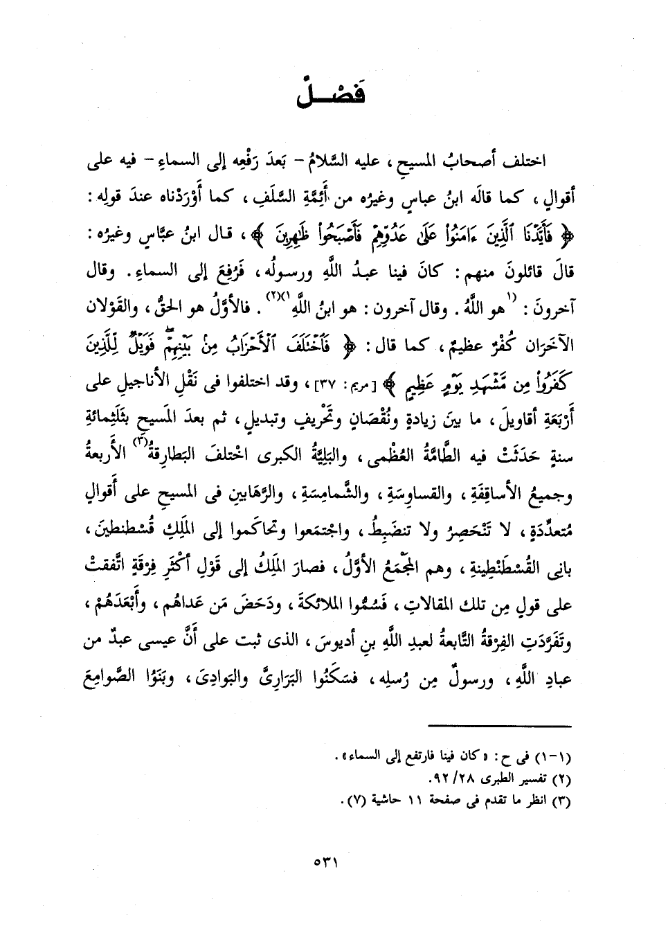 اخْتَلَفَ أَصْحَابُ الْمَسِيحِ، عَلَيْهِ السَّلَامُ - بَعْدَ رَفْعِهِ إِلَى السَّمَاءِ - فِيهِ عَلَى أَقْوَالٍ، كَمَا قَالَهُ ابْنُ عَبَّاسٍ وَغَيْرُهُ مِنْ أَئِمَّةِ السَّلَفِ، كَمَا أَوْرَدْنَاهُ عِنْدَ قَوْلِهِ: {فَأَيَّدْنَا الَّذِينَ آمَنُوا عَلَى عَدُوِّهِمْ فَأَصْبَحُوا ظَاهِرِينَ} [الصف: 14] قَالَ ابْنُ عَبَّاسٍ وَغَيْرُهُ: قَالَ قَائِلُونَ مِنْهُمْ: كَانَ فِينَا عَبْدُ اللَّهِ وَرَسُولُهُ، فَرُفِعَ إِلَى السَّمَاءِ. وَقَالَ آخَرُونَ: هُوَ اللَّهُ. وَقَالَ آخَرُونَ: هُوَ ابْنُ اللَّهِ. فَالْأَوَّلُ هُوَ الْحَقُّ، وَالْقَوْلَانِ الْآخَرَانِ كُفْرٌ عَظِيمٌ، كَمَا قَالَ: {فَاخْتَلَفَ الْأَحْزَابُ مِنْ بَيْنِهِمْ فَوَيْلٌ لِلَّذِينَ كَفَرُوا مِنْ مَشْهَدِ يَوْمٍ عَظِيمٍ} [مريم: 37] . وَقَدِ اخْتَلَفُوا فِي نَقْلِ الْأَنَاجِيلِ عَلَى أَرْبَعَةِ أَقَاوِيلَ، مَا بَيْنَ زِيَادَةٍ وَنُقْصَانٍ وَتَحْرِيفٍ وَتَبْدِيلٍ، ثُمَّ بَعْدَ الْمَسِيحِ بِثَلَاثِمِائَةِ سَنَةٍ حَدَثَتْ فِيهِ الطَّامَّةُ الْعُظْمَى، وَالْبَلِيَّةُ الْكُبْرَى اخْتَلَفَ الْبَطَارِكَةُ الْأَرْبَعَةُ وَجَمِيعُ الْأَسَاقِفَةِ وَالْقَسَاوِسَةُ وَالشَّمَامِسَةُ وَالرَّهَابِينُ فِي الْمَسِيحِ عَلَى أَقْوَالٍ مُتَعَدِّدَةٍ لَا تَنْحَصِرُ وَلَا تَنْضَبِطُ، وَاجْتَمَعُوا وَتَحَاكَمُوا إِلَى الْمَلِكِ قُسْطَنْطِينَ، بَانِي الْقُسْطَنْطِينِيَّةِ وَهُمُ الْمَجْمَعُ الْأَوَّلُ، فَصَارَ الْمَلِكُ إِلَى قَوْلِ أَكْثَرِ فِرْقَةٍ اتَّفَقَتْ عَلَى قَوْلٍ مِنْ تِلْكَ الْمَقَالَاتِ، فَسُمُّوا الْمَلَائِكَةَ، وَدَحَضَ مَنْ عَدَاهُمْ، وَأَبْعَدَهُمْ، وَتَفَرَّدَتِ الْفِرْقَةُ التَّابِعَةُ لِعَبْدِ اللَّهِ بْنِ أَدْيُوسَ، الَّذِي ثَبَتَ عَلَى أَنَّ عِيسَى عَبْدٌ مِنْ عِبَادِ اللَّهِ، وَرَسُولٌ مِنْ رُسُلِهِ، فَسَكَنُوا الْبَرَارِيَ وَالْبَوَادِيَ، وَبَنَوُا الصَّوَامِعَ