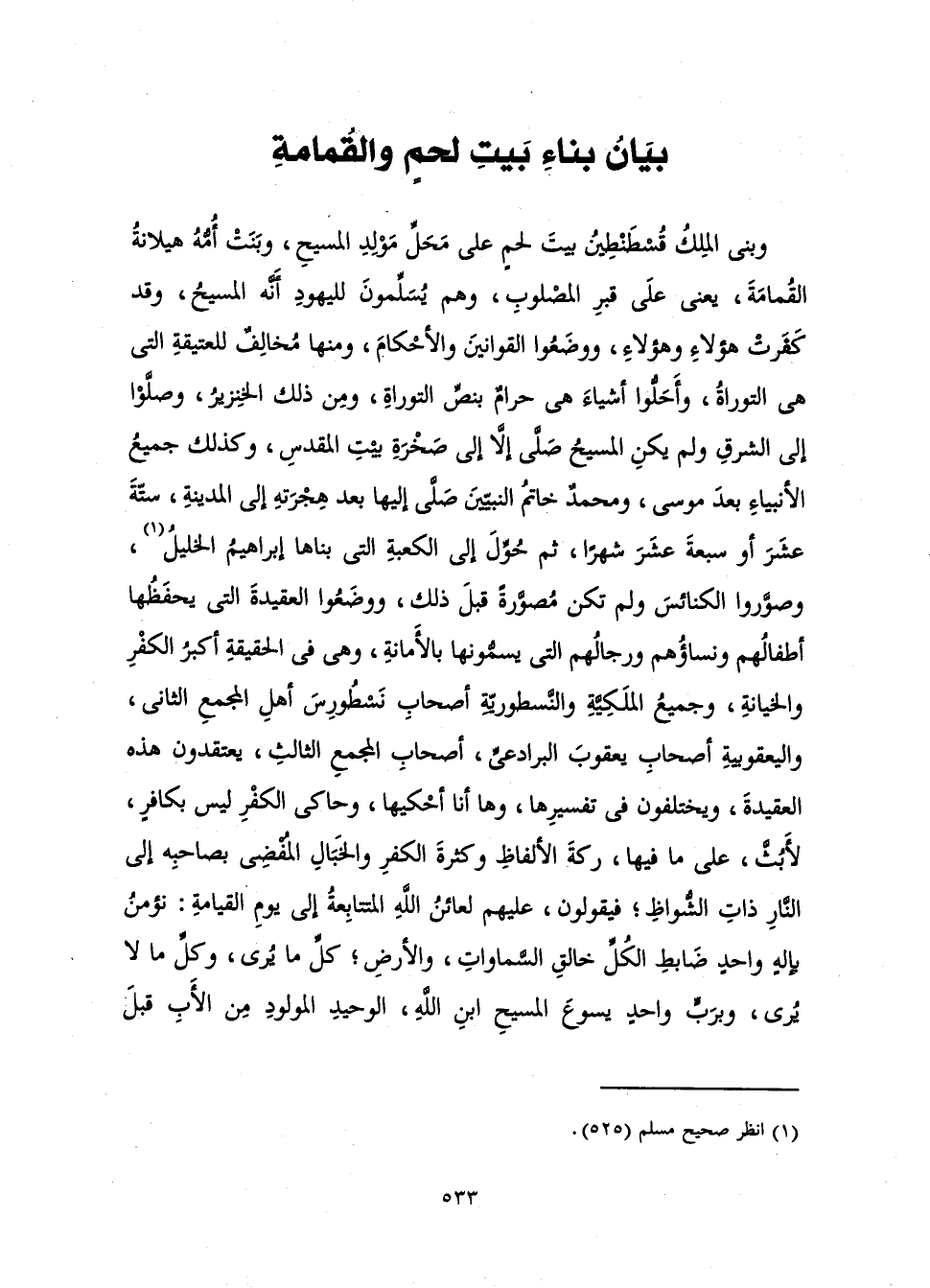 وَبَنَى الْمَلِكُ قُسْطَنْطِينُ بَيْتَ لَحْمٍ عَلَى مَحَلِّ مَوْلِدِ الْمَسِيحِ، وَبِنَتْ أُمُّهُ هِيلَانَةُ الْقُمَامَةَ، يَعْنِي عَلَى قَبْرِ الْمَصْلُوبِ، وَهُمْ يُسَلِّمُونَ لِلْيَهُودِ أَنَّهُ الْمَسِيحُ، وَقَدْ كَفَرَتْ هَؤُلَاءِ وَهَؤُلَاءِ، وَوَضَعُوا الْقَوَانِينَ وَالْأَحْكَامَ، وَمِنْهَا مُخَالِفٌ لِلْعَتِيقَةِ الَّتِي هِيَ التَّوْرَاةُ، وَأَحَلُّوا أَشْيَاءَ هِيَ حَرَامٌ بِنَصِّ التَّوْرَاةِ، وَمِنْ ذَلِكَ الْخِنْزِيرُ، وَصَلَّوْا إِلَى الشَّرْقِ وَلَمْ يَكُنِ الْمَسِيحُ صَلَّى إِلَّا إِلَى صَخْرَةِ بَيْتِ الْمَقْدِسِ، وَكَذَلِكَ جَمِيعُ الْأَنْبِيَاءِ بَعْدَ مُوسَى وَمُحَمَّدٌ خَاتَمُ النَّبِيِّينَ صَلَّى إِلَيْهَا بَعْدَ هِجْرَتِهِ إِلَى الْمَدِينَةِ، سِتَّةَ عَشَرَ - أَوْ سَبْعَةَ عَشَرَ - شَهْرًا، ثُمَّ حُوِّلَ إِلَى الْكَعْبَةِ الَّتِي بَنَاهَا إِبْرَاهِيمُ الْخَلِيلُ، وَصَوَّرُوا الْكَنَائِسَ وَلَمْ تَكُنْ مُصَوَّرَةً قَبْلَ ذَلِكَ، وَوَضَعُوا الْعَقِيدَةَ الَّتِي يَحْفَظُهَا أَطْفَالُهُمْ وَنِسَاؤُهُمْ وَرِجَالُهُمُ الَّتِي يُسَمُّونَهَا بِالْأَمَانَةِ وَهِيَ فِي الْحَقِيقَةِ أَكْبَرُ الْكُفْرِ وَالْخِيَانَةِ. وَجَمِيعُ الْمَلَكِيَّةِ وَالنَّسْطُورِيَّةِ أَصْحَابُ نَسْطُورَسَ أَهْلِ الْمَجْمَعِ الثَّانِي، وَالْيَعْقُوبِيَّةِ أَصْحَابِ يَعْقُوبَ الْبَرَادِعِيِّ، أَصْحَابِ الْمَجْمَعِ الثَّالِثِ، يَعْتَقِدُونَ هَذِهِ الْعَقِيدَةَ، وَيَخْتَلِفُونَ فِي تَفْسِيرِهَا، وَهَا أَنَا أَحْكِيهَا، وَحَاكِي الْكُفْرِ لَيْسَ بِكَافِرٍ لِأَبُثَّ، عَلَى مَا فِيهَا، رَكَّةَ الْأَلْفَاظِ وَكَثْرَةَ الْكُفْرِ وَالْخَبَالِ الْمُفْضِي بِصَاحِبِهِ إِلَى النَّارِ ذَاتِ الشُّوَاظِ ; فَيَقُولُونَ، عَلَيْهِمْ لَعَائِنُ اللَّهِ الْمُتَتَابِعَةُ إِلَى يَوْمِ الْقِيَامَةِ: نُؤْمِنُ بِإِلَهٍ وَاحِدٍ ضَابِطِ الْكُلِّ خَالِقِ السَّمَاوَاتِ وَالْأَرْضِ ; كُلِّ مَا يُرَى، وَكُلِّ مَا لَا يُرَى، وَبِرَبٍّ وَاحِدٍ يَسُوعَ الْمَسِيحِ ابْنِ اللَّهِ، الْوَحِيدِ الْمَوْلُودِ مِنَ الْأَبِ قَبْلَ
