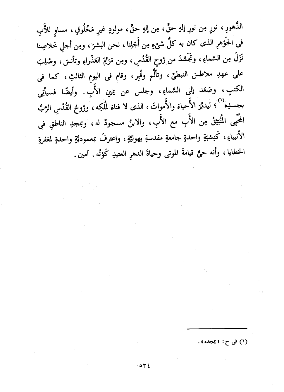 الدُّهُورِ، نُورٍ مِنْ نُورٍ إِلَهٍ حَقٍّ، مِنْ إِلَهٍ حَقٍّ، مَوْلُودٍ غَيْرِ مَخْلُوقٍ، مُسَاوٍ لِلْأَبِ فِي الْجَوْهَرِ الَّذِي كَانَ بِهِ كُلُّ شَيْءٍ مِنْ أَجْلِنَا، نَحْنُ الْبَشَرَ، وَمِنْ أَجْلِ خَلَاصِنَا نَزَلَ مِنَ السَّمَاءِ، وَتَجَسَّدَ مِنْ رُوحِ الْقُدُسِ، وَمِنْ مَرْيَمَ الْعَذْرَاءِ وَتَأَنَّسَ، وَصُلِبِ عَلَى عَهْدِ مَلَاطِسَ النَّبَطِيِّ، وَتَأَلَّمَ وَقُبِرَ، وَقَامَ فِي الْيَوْمِ الثَّالِثِ، كَمَا فِي الْكُتُبِ، وَصَعِدَ إِلَى السَّمَاءِ، وَجَلَسَ عَنْ يَمِينِ الْأَبِ. وَأَيْضًا فَسَيَأْتِي بِجَسَدِهِ ; لِيُدَبِّرَ الْأَحْيَاءَ وَالْأَمْوَاتَ، الَّذِي لَا فَنَاءَ لِمُلْكِهِ، وَرُوحُ الْقُدُسِ الرَّبُّ الْمُحْيِي الْمُنْبَثِقُ مِنَ الْأَبِ مَعَ الْأَبِ، وَالِابْنُ مَسْجُودٌ لَهُ، وَبِمَجْدِ النَّاطِقِ فِي الْأَنْبِيَاءِ، كَنِسْبَةٍ وَاحِدَةٍ جَامِعَةٍ مُقَدَّسَةٍ يَهُولِيَّةٍ، وَاعْتَرَفَ بِمَعْمُودِيَّةٍ وَاحِدَةٍ لِمَغْفِرَةِ الْخَطَايَا، وَأَنَّهُ حَيُّ قِيَامَةَ الْمَوْتَى وَحَيَاةَ الدَّهْرِ الْعَتِيدِ كَوْنُهُ. آمِينَ.
