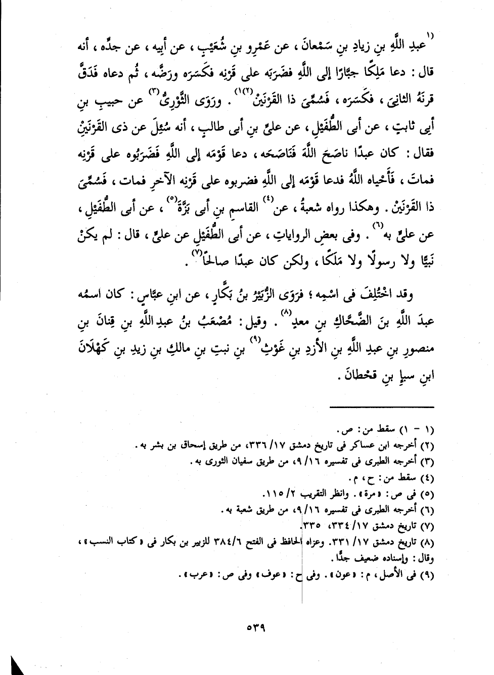 عَنْ عَبْدِ اللَّهِ بْنِ زِيَادِ بْنِ سَمْعَانَ، عَنْ عَمْرِو بْنِ شُعَيْبٍ، عَنْ أَبِيهِ، عَنْ جَدِّهِ، أَنَّهُ قَالَ: دَعَا مَلِكًا جَبَّارًا إِلَى اللَّهِ فَضَرَبَهُ عَلَى قَرْنِهِ فَكَسَرَهُ وَرَضَّهُ، ثُمَّ دَعَاهُ فَدَقَّ قَرْنَهُ الثَّانِيَ، فَكَسَرَهُ، فَسُمِّيَ ذَا الْقَرْنَيْنِ. وَرَوَى الثَّوْرِيُّ عَنْ حَبِيبِ بْنِ أَبِي ثَابِتٍ، عَنْ أَبِي الطُّفَيْلِ، عَنْ عَلِيِّ بْنِ أَبِي طَالِبٍ، أَنَّهُ سُئِلَ عَنْ ذِي الْقَرْنَيْنِ فَقَالَ: كَانَ عَبْدًا نَاصَحَ اللَّهَ فَنَاصَحَهُ، دَعَا قَوْمَهُ إِلَى اللَّهِ فَضَرَبُوهُ عَلَى قَرْنِهِ فَمَاتَ، فَأَحْيَاهُ اللَّهُ فَدَعَا قَوْمَهُ إِلَى اللَّهِ فَضَرَبُوهُ عَلَى قَرْنِهِ الْآخَرِ فَمَاتَ، فَسُمِّيَ ذَا الْقَرْنَيْنِ. وَهَكَذَا رَوَاهُ شُعْبَةُ، عَنِ الْقَاسِمِ بْنِ أَبِي بَزَّةَ، عَنْ أَبِي الطُّفَيْلِ، عَنْ عَلِيٍّ بِهِ. وَفِي بَعْضِ الرِّوَايَاتِ، عَنْ أَبِي الطُّفَيْلِ عَنْ عَلِيٍّ، قَالَ: لَمْ يَكُنْ نَبِيًّا وَلَا رَسُولًا وَلَا مَلَكًا، وَلَكِنْ كَانَ عَبْدًا صَالِحًا.
