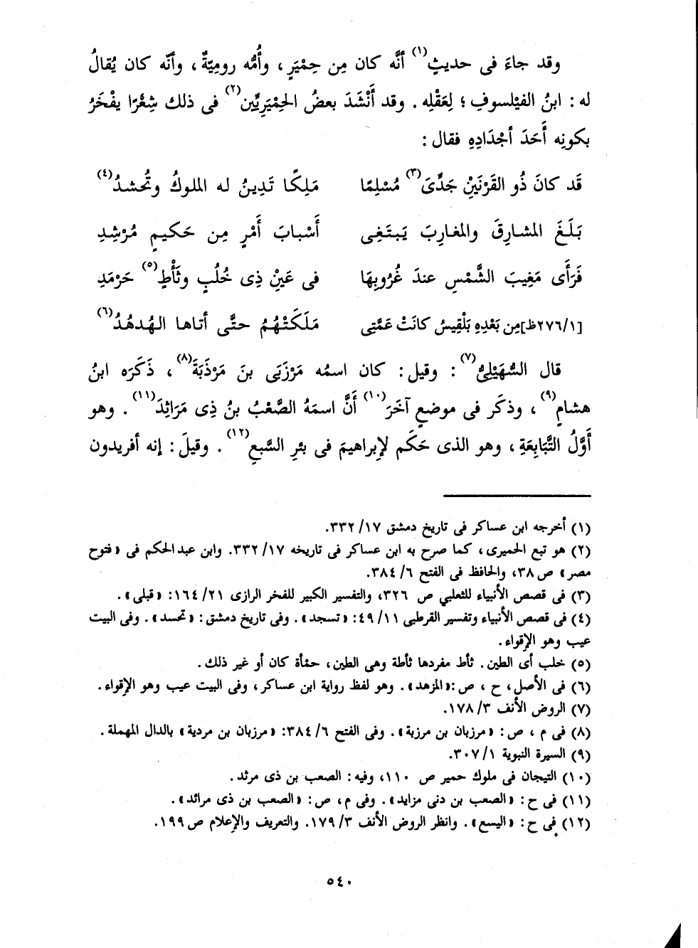 قَالَ السُّهَيْلِيُّ: وَقِيلَ: كَانَ اسْمُهُ مَرْزَبَى بْنَ مَرْذَبَةَ، ذَكَرَهُ ابْنُ هِشَامٍ، وَذَكَرَ فِي مَوْضِعٍ آخَرَ أَنَّ اسْمَهُ الصَّعْبُ بْنُ ذِي مَرَاثِدَ. وَهُوَ أَوَّلُ التَّبَابِعَةِ، وَهُوَ الَّذِي حَكَمَ لِإِبْرَاهِيمَ فِي بِئْرِ السَّبْعِ. وَقِيلَ: إِنَّهُ أَفْرِيدُونُ