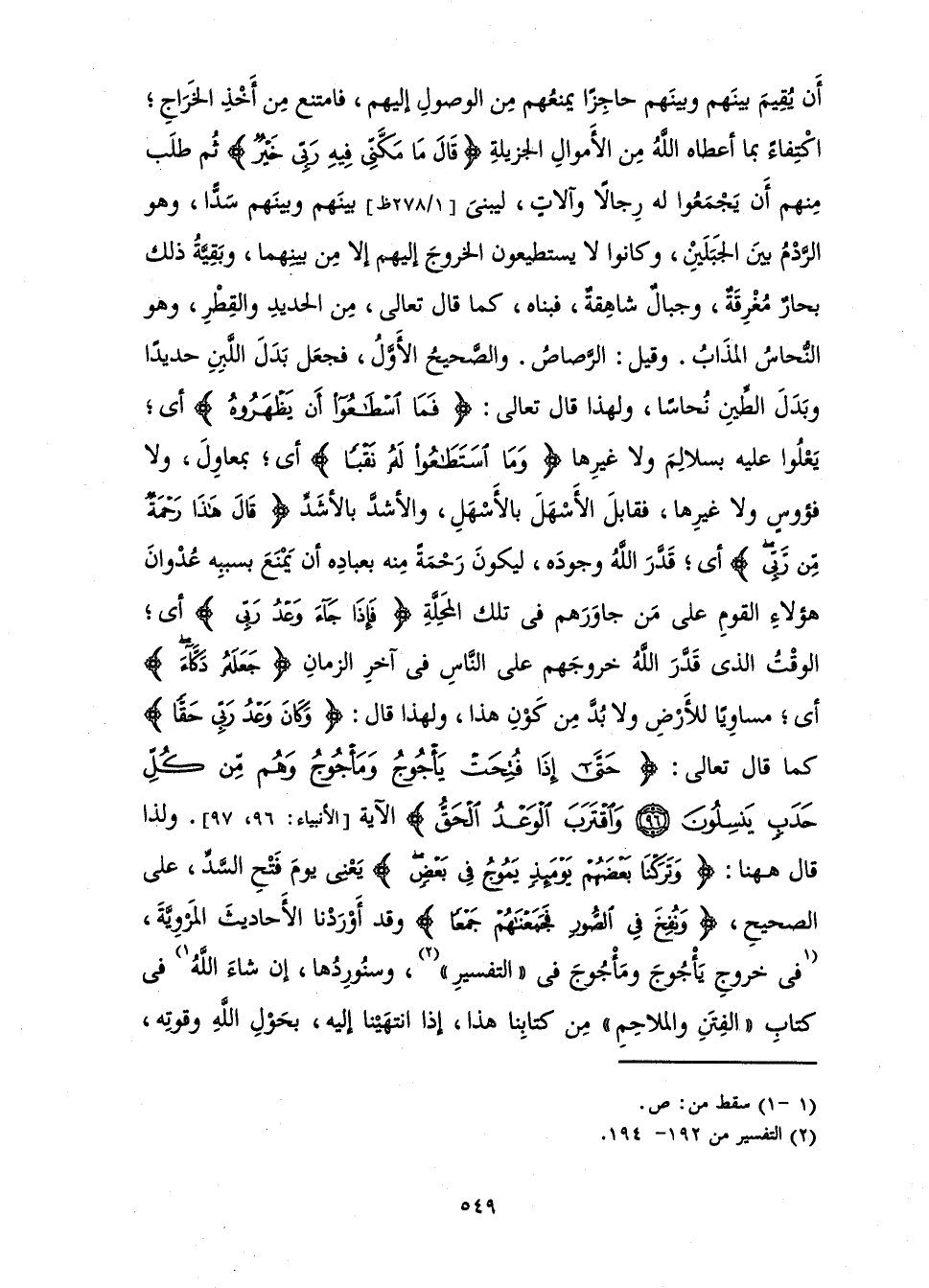 أَنْ يُقِيمَ بَيْنَهُمْ وَبَيْنَهُمْ حَاجِزًا يَمْنَعُهُمْ مِنَ الْوُصُولِ إِلَيْهِمْ، فَامْتَنَعَ مِنْ أَخْذِ الْخَرَاجِ ; اكْتِفَاءً بِمَا أَعْطَاهُ اللَّهُ مِنَ الْأَمْوَالِ الْجَزِيلَةِ {قَالَ مَا مَكَّنِّي فِيهِ رَبِّي خَيْرٌ} [الكهف: 95] ثُمَّ طَلَبَ مِنْهُمْ أَنْ يَجْمَعُوا لَهُ رِجَالًا وَآلَاتٍ لِيَبْنِيَ بَيْنَهُمْ وَبَيْنَهُمْ سَدًّا، وَهُوَ الرَّدْمُ بَيْنَ الْجَبَلَيْنِ، وَكَانُوا لَا يَسْتَطِيعُونَ الْخُرُوجَ إِلَيْهِمْ إِلَّا مِنْ بَيْنِهِمَا، وَبَقِيَّةُ ذَلِكَ بِحَارٌ مُغْرِقَةٌ، وَجِبَالٌ شَاهِقَةٌ، فَبَنَاهُ، كَمَا قَالَ تَعَالَى، مِنَ الْحَدِيدِ وَالْقِطْرِ، وَهُوَ النُّحَاسُ الْمُذَابُ، وَقِيلَ: الرَّصَاصُ. وَالصَّحِيحُ الْأَوَّلُ، فَجَعَلَ بَدَلَ اللَّبِنِ حَدِيدًا، وَبَدَلَ الطِّينِ نُحَاسًا، وَلِهَذَا قَالَ تَعَالَى: {فَمَا اسْطَاعُوا أَنْ يَظْهَرُوهُ} [الكهف: 97] أَيْ: يَعْلُوَا عَلَيْهِ بِسَلَالِمَ وَلَا غَيْرِهَا {وَمَا اسْتَطَاعُوا لَهُ نَقْبًا} [الكهف: 97] أَيْ: بِمَعَاوِلَ وَلَا فُؤُوسٍ وَلَا غَيْرِهَا، فَقَابَلَ الْأَسْهَلَ بِالْأَسْهَلِ وَالْأَشَدَّ بِالْأَشَدِّ {قَالَ هَذَا رَحْمَةٌ مِنْ رَبِّي} [الكهف: 98] أَيْ: قَدَّرَ اللَّهُ وُجُودَهُ لِيَكُونَ رَحْمَةً مِنْهُ بِعِبَادِهِ أَنْ يَمْنَعَ بِسَبَبِهِ عُدْوَانَ هَؤُلَاءِ الْقَوْمِ عَلَى مَنْ جَاوَرَهُمْ فِي تِلْكَ الْمَحِلَّةِ {فَإِذَا جَاءَ وَعْدُ رَبِّي} [الكهف: 98] أَيِ الْوَقْتُ الَّذِي قَدَّرَ خُرُوجَهُمْ عَلَى النَّاسِ فِي آخِرِ الزَّمَانِ {جَعَلَهُ دَكَّاءَ} [الكهف: 98] أَيْ مُسَاوِيًا لِلْأَرْضِ. وَلَا بُدَّ مِنْ كَوْنِ هَذَا، وَلِهَذَا قَالَ: {وَكَانَ وَعْدُ رَبِّي حَقًّا} [الكهف: 98] كَمَا قَالَ تَعَالَى: {حَتَّى إِذَا فُتِحَتْ يَأْجُوجُ وَمَأْجُوجُ وَهُمْ مِنْ كُلِّ حَدَبٍ يَنْسِلُونَ وَاقْتَرَبَ الْوَعْدُ الْحَقُّ} [الأنبياء: 96] الْآيَةَ [الْأَنْبِيَاءِ: 96، 97] . وَلِذَا قَالَ هَاهُنَا: {وَتَرَكْنَا بَعْضَهُمْ يَوْمَئِذٍ يَمُوجُ فِي بَعْضٍ} [الكهف: 99] يَعْنِي يَوْمَ فَتْحِ السَّدِّ، عَلَى الصَّحِيحِ {وَنُفِخَ فِي الصُّورِ فَجَمَعْنَاهُمْ جَمْعًا} [الكهف: 99] وَقَدْ أَوْرَدْنَا الْأَحَادِيثَ الْمَرْوِيَّةَ، فِي خُرُوجِ يَأْجُوجَ وَمَأْجُوجَ فِي " التَّفْسِيرِ " وَسَنُورِدُهَا، إِنْ شَاءَ اللَّهُ فِي كِتَابِ " الْفِتَنِ وَالْمَلَاحِمِ " مِنْ كِتَابِنَا هَذَا، إِذَا انْتَهَيْنَا إِلَيْهِ، بِحَوَلِ اللَّهِ وَقُوَّتِهِ،