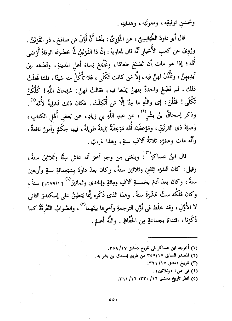 قَالَ أَبُو دَاوُدَ الطَّيَالِسِيُّ، عَنِ الثَّوْرِيِّ: بَلَغَنَا أَنَّ أَوَّلَ مَنْ صَافَحَ، ذُو الْقَرْنَيْنِ. وَرُوِيَ عَنْ كَعْبِ الْأَحْبَارِ أَنَّهُ قَالَ لِمُعَاوِيَةَ: إِنَّ ذَا الْقَرْنَيْنِ لَمَّا حَضَرَتْهُ الْوَفَاةُ أَوْصَى أُمَّهُ ; إِذَا هُوَ مَاتَ أَنْ تَصْنَعَ طَعَامًا، وَتَجْمَعَ نِسَاءَ أَهْلِ الْمَدِينَةِ وَتَضَعَهُ بَيْنَ أَيْدِيهِنَّ، وَتَأْذَنَ لَهُنَّ فِيهِ، إِلَّا مَنْ كَانَتْ ثَكْلَى، فَلَا تَأْكُلْ مِنْهُ شَيْئًا، فَلَمَّا فَعَلَتْ ذَلِكَ لَمْ تَضَعْ وَاحِدَةٌ مِنْهُنَّ يَدَهَا فِيهِ، فَقَالَتْ لَهُنَّ: سُبْحَانَ اللَّهِ! كُلُّكُنَّ ثَكْلَى! فَقُلْنَ: أَيْ وَاللَّهِ مَا مِنَّا إِلَّا مَنْ أُثْكِلَتْ. فَكَانَ ذَلِكَ تَسْلِيَةً لِأُمِّهِ. وَذَكَرَ إِسْحَاقُ بْنُ بِشْرٍ، عَنْ عَبْدِ اللَّهِ بْنِ زِيَادٍ، عَنْ بَعْضِ أَهْلِ الْكِتَابِ، وَصِيَّةَ ذِي الْقَرْنَيْنِ وَمَوْعِظَتَهُ أُمَّهُ مَوْعِظَةً بَلِيغَةً طَوِيلَةً، فِيهَا حِكَمٌ وَأُمُورٌ نَافِعَةٌ، وَأَنَّهُ مَاتَ وَعُمْرُهُ ثَلَاثَةُ آلَافِ سَنَةٍ، وَهَذَا غَرِيبٌ.