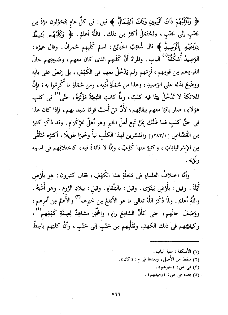 {وَنُقَلِّبُهُمْ ذَاتَ الْيَمِينِ وَذَاتَ الشِّمَالِ} [الكهف: 18] قِيلَ: فِي كُلِّ عَامٍ يَتَحَوَّلُونَ مَرَّةً مِنْ جَنْبٍ إِلَى جَنْبٍ، وَيَحْتَمِلُ أَكْثَرَ مِنْ ذَلِكَ. فَاللَّهُ أَعْلَمُ. {وَكَلْبُهُمْ بَاسِطٌ ذِرَاعَيْهِ بِالْوَصِيدِ} [الكهف: 18] قَالَ شُعَيْبٌ الْجَبَائِيُّ: اسْمُ كَلْبِهِمْ حُمْرَانُ. وَقَالَ غَيْرُهُ: الْوَصِيدُ أُسْكُفَّةُ الْبَابِ. وَالْمُرَادُ أَنَّ كَلْبَهُمُ الَّذِي كَانَ مَعَهُمْ، وَصَحِبَهُمْ حَالَ انْفِرَادِهِمْ مِنْ قَوْمِهِمْ، لَزِمَهُمْ وَلَمْ يَدْخُلْ مَعَهُمْ فِي الْكَهْفِ، بَلْ رَبَضَ عَلَى بَابِهِ وَوَضَعَ يَدَيْهِ عَلَى الْوَصِيدِ، وَهَذَا مِنْ جُمْلَةِ أَدَبِهِ وَمِنْ جُمْلَةِ مَا أُكْرِمُوا بِهِ ; فَإِنَّ الْمَلَائِكَةَ لَا تَدْخُلُ بَيْتًا فِيهِ كَلْبٌ، وَلَمَّا كَانَتِ التَّبَعِيَّةُ مُؤَثِّرَةً، حَتَّى فِي كَلْبِ هَؤُلَاءِ، صَارَ بَاقِيًا مَعَهُمْ بِبَقَائِهِمْ ; لِأَنَّ مَنْ أَحَبَّ قَوْمًا سَعِدَ بِهِمْ، فَإِذَا كَانَ هَذَا فِي حَقِّ كَلْبٍ فَمَا ظَنُّكَ بِمَنْ تَبِعَ أَهْلَ الْخَيْرِ وَهُوَ أَهْلٌ لِلْإِكْرَامِ. وَقَدْ ذَكَرَ كَثِيرٌ مِنَ الْقُصَّاصِ وَالْمُفَسِّرِينَ لِهَذَا الْكَلْبِ نَبَأً وَخَبَرًا طَوِيلًا، أَكْثَرُهُ مُتَلَقًّى مِنَ الْإِسْرَائِيلِيَّاتِ، وَكَثِيرٌ مِنْهَا كَذِبٌ، وَمِمَّا لَا فَائِدَةَ فِيهِ، كَاخْتِلَافِهِمْ فِي اسْمِهِ وَلَوْنِهِ.