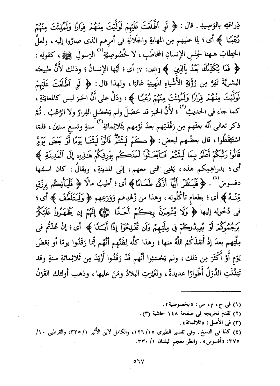 ذِرَاعَيْهِ بِالْوَصِيدِ. قَالَ: {لَوِ اطَّلَعْتَ عَلَيْهِمْ لَوَلَّيْتَ مِنْهُمْ فِرَارًا وَلَمُلِئْتَ مِنْهُمْ رُعْبًا} [الكهف: 18] أَيْ: لِمَا عَلَيْهِمْ مِنَ الْمَهَابَةِ وَالْجَلَالَةِ فِي أَمْرِهِمُ الَّذِي صَارُوا إِلَيْهِ، وَلَعَلَّ الْخِطَابَ هَاهُنَا لِجِنْسِ الْإِنْسَانِ الْمُخَاطَبِ، لَا لِخُصُوصِيَّةِ الرَّسُولِ صَلَّى اللَّهُ عَلَيْهِ وَسَلَّمَ، كَقَوْلِهِ: {فَمَا يُكَذِّبُكَ بَعْدُ بِالدِّينِ} [التين: 7] . أَيْ: أَيُّهَا الْإِنْسَانُ ; وَذَلِكَ لِأَنَّ طَبِيعَةَ الْبَشَرِيَّةِ تَفِرُّ مِنْ رُؤْيَةِ الْأَشْيَاءِ الْمَهِيبَةِ غَالِبًا، وَلِهَذَا قَالَ: {لَوِ اطَّلَعْتَ عَلَيْهِمْ لَوَلَّيْتَ مِنْهُمْ فِرَارًا وَلَمُلِئْتَ مِنْهُمْ رُعْبًا} [الكهف: 18] ، وَدَلَّ عَلَى أَنَّ الْخَبَرَ لَيْسَ كَالْمُعَايَنَةِ، كَمَا جَاءَ فِي الْحَدِيثِ; لِأَنَّ الْخَبَرَ قَدْ حَصَلَ وَلَمْ يَحْصُلِ الْفِرَارُ وَلَا الرُّعْبُ. ثُمَّ ذَكَرَ تَعَالَى أَنَّهُ بَعَثَهُمْ مِنْ رَقْدَتِهِمْ بَعْدَ نَوْمِهِمْ بِثَلَاثِمِائَةِ سَنَةٍ وَتِسْعِ سِنِينَ، فَلَمَّا اسْتَيْقَظُوا، قَالَ بَعْضُهُمْ لِبَعْضٍ: {كَمْ لَبِثْتُمْ قَالُوا لَبِثْنَا يَوْمًا أَوْ بَعْضَ يَوْمٍ قَالُوا رَبُّكُمْ أَعْلَمُ بِمَا لَبِثْتُمْ فَابْعَثُوا أَحَدَكُمْ بِوَرِقِكُمْ هَذِهِ إِلَى الْمَدِينَةِ} [الكهف: 19] أَيْ: بِدَرَاهِمِكُمْ هَذِهِ، يَعْنِي الَّتِي مَعَهُمْ، إِلَى الْمَدِينَةِ. وَيُقَالُ، كَانَ اسْمُهَا دَفْسُوسَ. {فَلْيَنْظُرْ أَيُّهَا أَزْكَى طَعَامًا} [الكهف: 19] أَيْ: أَطْيَبَ مَالًا {فَلْيَأْتِكُمْ بِرِزْقٍ مِنْهُ} [الكهف: 19] أَيْ: بِطَعَامٍ تَأْكُلُونَهُ، وَهَذَا مِنْ زُهْدِهِمْ وَوَرَعِهِمْ {وَلْيَتَلَطَّفْ} [الكهف: 19] أَيْ: فِي دُخُولِهِ إِلَيْهَا {وَلَا يُشْعِرَنَّ بِكُمْ أَحَدًا إِنَّهُمْ إِنْ يَظْهَرُوا عَلَيْكُمْ يَرْجُمُوكُمْ أَوْ يُعِيدُوكُمْ فِي مِلَّتِهِمْ وَلَنْ تُفْلِحُوا إِذًا أَبَدًا} [الكهف: 19] أَيْ: إِنْ عُدْتُمْ فِي مِلَّتِهِمْ بَعْدَ إِذْ أَنْقَذَكُمُ اللَّهُ مِنْهَا ; وَهَذَا كُلُّهُ لِظَنِّهِمْ أَنَّهُمْ رَقَدُوا يَوْمًا أَوْ بَعْضَ يَوْمٍ أَوْ أَكْثَرَ مِنْ ذَلِكَ، وَلَمْ يَحْسَبُوا أَنَّهُمْ قَدْ رَقَدُوا أَزْيَدَ مِنْ ثَلَاثِمِائَةِ سَنَةٍ وَقَدْ تَبَدَّلَتِ الدُّوَلُ أَطْوَارًا عَدِيدَةً، وَتَغَيَّرَتِ الْبِلَادُ وَمَنْ عَلَيْهَا، وَذَهَبَ أُولَئِكَ الْقَرْنُ