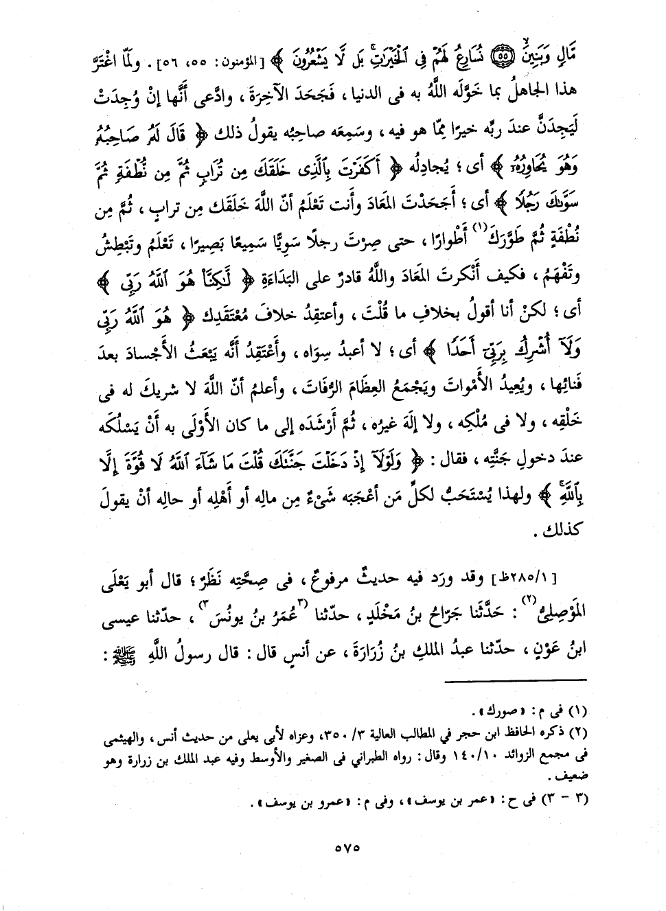 {أَيَحْسَبُونَ أَنَّمَا نُمِدُّهُمْ بِهِ مِنْ مَالٍ وَبَنِينَ نُسَارِعُ لَهُمْ فِي الْخَيْرَاتِ بَلْ لَا يَشْعُرُونَ} [المؤمنون: 55] أَيْ: يُجَادِلُهُ {أَكَفَرْتَ بِالَّذِي خَلَقَكَ مِنْ تُرَابٍ ثُمَّ مِنْ نُطْفَةٍ ثُمَّ سَوَّاكَ رَجُلًا} [الكهف: 37] أَيْ: أَجَحَدْتَ الْمَعَادَ وَأَنْتَ تَعْلَمُ أَنَّ اللَّهَ خَلَقَكَ مِنْ تُرَابٍ، ثُمَّ مِنْ نُطْفَةٍ ثُمَّ صَوَّرَكَ أَطْوَارًا حَتَّى صِرْتَ رَجُلًا سَوِيًّا سَمِيعًا بَصِيرًا، تَعْلَمُ وَتَبْطِشُ وَتَفْهَمُ، فَكَيْفَ أَنْكَرْتَ الْمَعَادَ وَاللَّهُ قَادِرٌ عَلَى الْبَدَاءَةِ {لَكِنَّا هُوَ اللَّهُ رَبِّي} [الكهف: 38] أَيْ: لَكِنْ أَنَا أَقُولُ بِخِلَافِ مَا قُلْتَ وَأَعْتَقِدُ خِلَافَ مُعْتَقَدِكَ {هُوَ اللَّهُ رَبِّي وَلَا أُشْرِكُ بِرَبِّي أَحَدًا} [الكهف: 38] أَيْ: لَا أَعْبُدُ سِوَاهُ، وَأَعْتَقِدَ أَنَّهُ يَبْعَثُ الْأَجْسَادَ بَعْدَ فَنَائِهَا، وَيُعِيدُ الْأَمْوَاتَ، وَيَجْمَعُ الْعِظَامَ الرُّفَاتَ، وَأَعْلَمُ أَنَّ اللَّهَ لَا شَرِيكَ لَهُ فِي خَلْقِهِ، وَلَا فِي مُلْكِهِ، وَلَا إِلَهَ غَيْرُهُ. ثُمَّ أَرْشَدَهُ إِلَى مَا كَانَ الْأَوْلَى بِهِ أَنْ يَسْلُكَهُ عِنْدَ دُخُولِ جَنَّتِهِ فَقَالَ: {وَلَوْلَا إِذْ دَخَلْتَ جَنَّتَكَ قُلْتَ مَا شَاءَ اللَّهُ لَا قُوَّةَ إِلَّا بِاللَّهِ} [الكهف: 39] وَلِهَذَا يُسْتَحَبُّ لِكُلِّ مَنْ أَعْجَبَهُ شَيْءٌ مِنْ مَالِهِ أَوْ أَهْلِهِ أَوْ حَالِهِ أَنْ يَقُولَ كَذَلِكَ.
