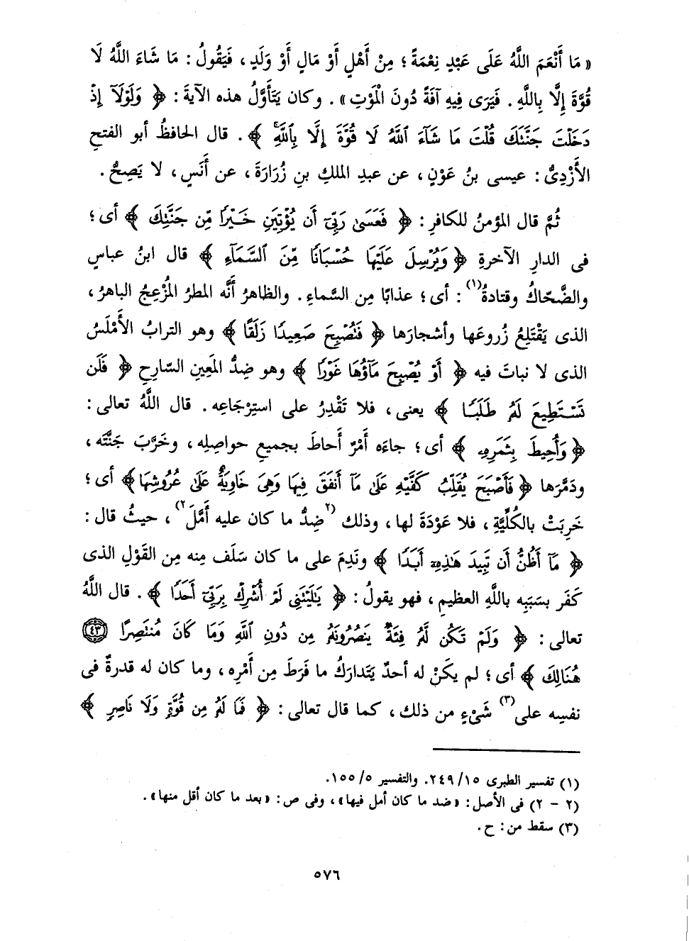 «مَا أَنْعَمَ اللَّهُ عَلَى عَبْدٍ نِعْمَةً مِنْ أَهْلٍ أَوْ مَالٍ أَوْ وَلَدٍ فَيَقُولُ: مَا شَاءَ اللَّهُ لَا قُوَّةَ إِلَّا بِاللَّهِ. فَيَرَى فِيهِ آفَةً دُونَ الْمَوْتِ» وَكَانَ يَتَأَوَّلُ هَذِهِ الْآيَةَ: {وَلَوْلَا إِذْ دَخَلْتَ جَنَّتَكَ قُلْتَ مَا شَاءَ اللَّهُ لَا قُوَّةَ إِلَّا بِاللَّهِ} [الكهف: 39] قَالَ الْحَافِظُ أَبُو الْفَتْحِ الْأَزْدِيُّ: عِيسَى بْنُ عَوْنٍ، عَنْ عَبْدِ الْمَلِكِ بْنِ زُرَارَةَ، عَنْ أَنَسٍ، لَا يَصِحُّ.