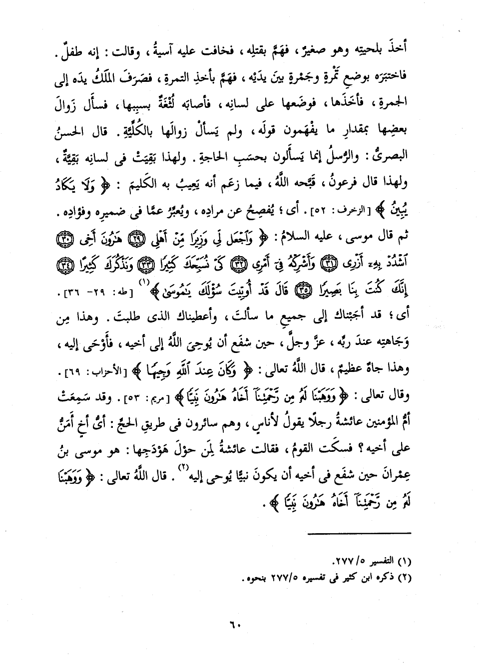 [طه: 29 - 36] . أَيْ; قَدْ أَجَبْنَاكَ إِلَى جَمِيعِ مَا سَأَلْتَ، وَأَعْطَيْنَاكَ الَّذِي طَلَبْتَ. وَهَذَا مِنْ وَجَاهَتِهِ عِنْدَ رَبِّهِ عَزَّ وَجَلَّ، حِينَ شَفَعَ أَنْ يُوحِيَ اللَّهُ إِلَى أَخِيهِ فَأَوْحَى إِلَيْهِ، وَهَذَا جَاهٌ عَظِيمٌ، قَالَ اللَّهُ تَعَالَى: وَكَانَ عِنْدَ اللَّهِ وَجِيهًا [الْأَحْزَابِ: 69] . وَقَالَ تَعَالَى: {وَوَهَبْنَا لَهُ مِنْ رَحْمَتِنَا أَخَاهُ هَارُونَ نَبِيًّا} [مريم: 53] . وَقَدْ سَمِعَتْ أُمُّ الْمُؤْمِنِينَ عَائِشَةُ رَجُلًا يَقُولُ لِأُنَاسٍ، وَهُمْ سَائِرُونَ فِي طَرِيقِ الْحَجِّ: أَيُّ أَخٍ أَمَنُّ عَلَى أَخِيهِ؟ فَسَكَتَ الْقَوْمُ، فَقَالَتْ عَائِشَةُ لِمَنْ حَوْلَ هَوْدَجِهَا: هُوَ مُوسَى بْنُ عِمْرَانَ حِينَ شَفَعَ فِي أَخِيهِ أَنْ يَكُونَ نَبِيًّا يُوحَى إِلَيْهِ. قَالَ اللَّهُ تَعَالَى: {وَوَهَبْنَا لَهُ مِنْ رَحْمَتِنَا أَخَاهُ هَارُونَ نَبِيًّا} [مريم: 53] .
