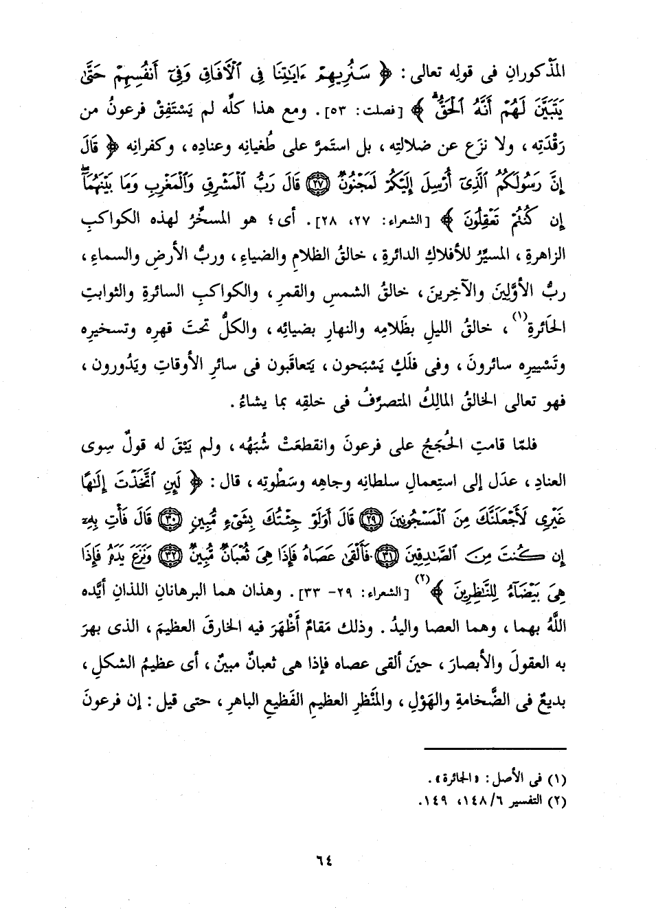 [الشُّعَرَاءِ: 29 - 33] . وَهَذَانِ هُمَا الْبُرْهَانَانِ اللَّذَانِ أَيَّدَهُ اللَّهُ بِهِمَا، وَهَمَا الْعَصَا وَالْيَدُ. وَذَلِكَ مَقَامٌ أَظْهَرَ فِيهِ الْخَارِقَ الْعَظِيمَ، الَّذِي بَهَرَ بِهِ الْعُقُولَ وَالْأَبْصَارَ، حِينَ أَلْقَى عَصَاهُ فَإِذَا هِيَ ثُعْبَانٌ مُبِينٌ، أَيْ عَظِيمُ الشَّكْلِ، بَدِيعٌ فِي الضَّخَامَةِ وَالْهَوْلِ، وَالْمَنْظَرِ الْعَظِيمِ الْفَظِيعِ الْبَاهِرِ، حَتَّى قِيلَ: إِنَّ فِرْعَوْنَ