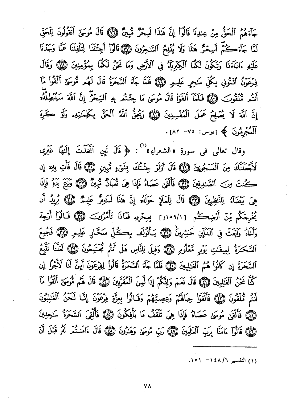 {ثُمَّ بَعَثْنَا مِنْ بَعْدِهِمْ مُوسَى وَهَارُونَ إِلَى فِرْعَوْنَ وَمَلَئِهِ بِآيَاتِنَا فَاسْتَكْبَرُوا وَكَانُوا قَوْمًا مُجْرِمِينَ - فَلَمَّا جَاءَهُمُ الْحَقُّ مِنْ عِنْدِنَا قَالُوا إِنَّ هَذَا لَسِحْرٌ مُبِينٌ - قَالَ مُوسَى أَتَقُولُونَ لِلْحَقِّ لَمَّا جَاءَكُمْ أَسِحْرٌ هَذَا وَلَا يُفْلِحُ السَّاحِرُونَ - قَالُوا أَجِئْتَنَا لِتَلْفِتَنَا عَمَّا وَجَدْنَا عَلَيْهِ آبَاءَنَا وَتَكُونَ لَكُمَا الْكِبْرِيَاءُ فِي الْأَرْضِ وَمَا نَحْنُ لَكُمَا بِمُؤْمِنِينَ - وَقَالَ فِرْعَوْنُ ائْتُونِي بِكُلِّ سَاحِرٍ عَلِيمٍ - فَلَمَّا جَاءَ السَّحَرَةُ قَالَ لَهُمْ مُوسَى أَلْقُوا مَا أَنْتُمْ مُلْقُونَ - فَلَمَّا أَلْقَوْا قَالَ مُوسَى مَا جِئْتُمْ بِهِ السِّحْرُ إِنَّ اللَّهَ سَيُبْطِلُهُ إِنَّ اللَّهَ لَا يُصْلِحُ عَمَلَ الْمُفْسِدِينَ - وَيُحِقُّ اللَّهُ الْحَقَّ بِكَلِمَاتِهِ وَلَوْ كَرِهَ الْمُجْرِمُونَ} [يونس: 75 - 82]