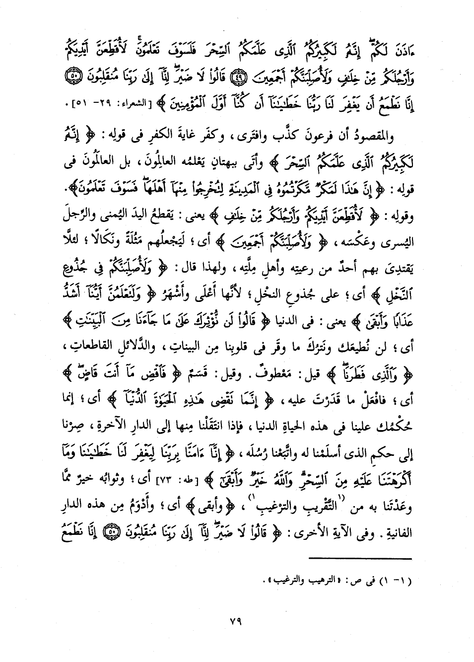 وَالْمَقْصُودُ أَنَّ فِرْعَوْنَ كَذَّبَ وَافْتَرَى، وَكَفَرَ غَايَةَ الْكُفْرِ فِي قَوْلِهِ: {إِنَّهُ لَكَبِيرُكُمُ الَّذِي عَلَّمَكُمُ السِّحْرَ} [الشعراء: 49] وَأَتَى بِبُهْتَانٍ يَعْلَمُهُ الْعَالِمُونَ، بَلِ الْعَالَمُونَ فِي قَوْلِهِ: {إِنَّ هَذَا لَمَكْرٌ مَكَرْتُمُوهُ فِي الْمَدِينَةِ لِتُخْرِجُوا مِنْهَا أَهْلَهَا فَسَوْفَ تَعْلَمُونَ} [الأعراف: 123] وَقَوْلُهُ: {لَأُقَطِّعَنَّ أَيْدِيَكُمْ وَأَرْجُلَكُمْ مِنْ خِلَافٍ} [الشعراء: 49] يَعْنِي: يَقْطَعُ الْيَدَ الْيُمْنَى وَالرِّجْلَ الْيُسْرَى وَعَكْسَهُ، {وَلَأُصَلِّبَنَّكُمْ أَجْمَعِينَ} [الشعراء: 49] أَيْ; لَيَجْعَلُهُمْ مَثُلَةً وَنَكَالًا; لِئَلَّا يَقْتَدِيَ بِهِمْ أَحَدٌ مِنْ رَعِيَّتِهِ وَأَهْلِ مِلَّتِهِ، وَلِهَذَا قَالَ: {وَلَأُصَلِّبَنَّكُمْ فِي جُذُوعِ النَّخْلِ} [طه: 71] أَيْ; عَلَى جُذُوعِ النَّخْلِ; لِأَنَّهَا أَعْلَى وَأَشْهَرُ {وَلَتَعْلَمُنَّ أَيُّنَا أَشَدُّ عَذَابًا وَأَبْقَى} [طه: 71] يَعْنِي: فِي الدُّنْيَا قَالُوا {لَنْ نُؤْثِرَكَ عَلَى مَا جَاءَنَا مِنَ الْبَيِّنَاتِ} [طه: 72] أَيْ; لَنْ نُطِيعَكَ وَنَتْرُكَ مَا وَقَرَ فِي قُلُوبِنَا مِنَ الْبَيِّنَاتِ، وَالدَّلَائِلِ الْقَاطِعَاتِ، وَالَّذِي فَطَرَنَا قِيلَ: مَعْطُوفٌ. وَقِيلَ: قَسَمٌ {فَاقْضِ مَا أَنْتَ قَاضٍ} [طه: 72] أَيْ; فَافْعَلْ مَا قَدَرْتَ عَلَيْهِ {إِنَّمَا تَقْضِي هَذِهِ الْحَيَاةَ الدُّنْيَا} [طه: 72] أَيْ; إِنَّمَا حُكْمُكَ عَلَيْنَا فِي هَذِهِ الْحَيَاةِ الدُّنْيَا، فَإِذَا انْتَقَلْنَا مِنْهَا إِلَى الدَّارِ الْآخِرَةِ، صِرْنَا إِلَى حُكْمِ الَّذِي أَسْلَمْنَا لَهُ وَاتَّبَعْنَا رُسُلَهُ {إِنَّا آمَنَّا بِرَبِّنَا لِيَغْفِرَ لَنَا خَطَايَانَا وَمَا أَكْرَهْتَنَا عَلَيْهِ مِنَ السِّحْرِ وَاللَّهُ خَيْرٌ وَأَبْقَى} [طه: 73] . أَيْ; وَثَوَابُهُ خَيْرٌ مِمَّا وَعَدَتْنَا بِهِ مِنَ التَّقْرِيبِ وَالتَّرْغِيبِ، وَأَبْقَى أَيْ; وَأَدْوَمُ مِنْ هَذِهِ الدَّارِ الْفَانِيَةِ. وَفِي الْآيَةِ الْأُخْرَى: قَالُوا {لَا ضَيْرَ إِنَّا إِلَى رَبِّنَا مُنْقَلِبُونَ - إِنَّا نَطْمَعُ أَنْ يَغْفِرَ لَنَا رَبُّنَا خَطَايَانَا} [الشعراء: 50 - 51]