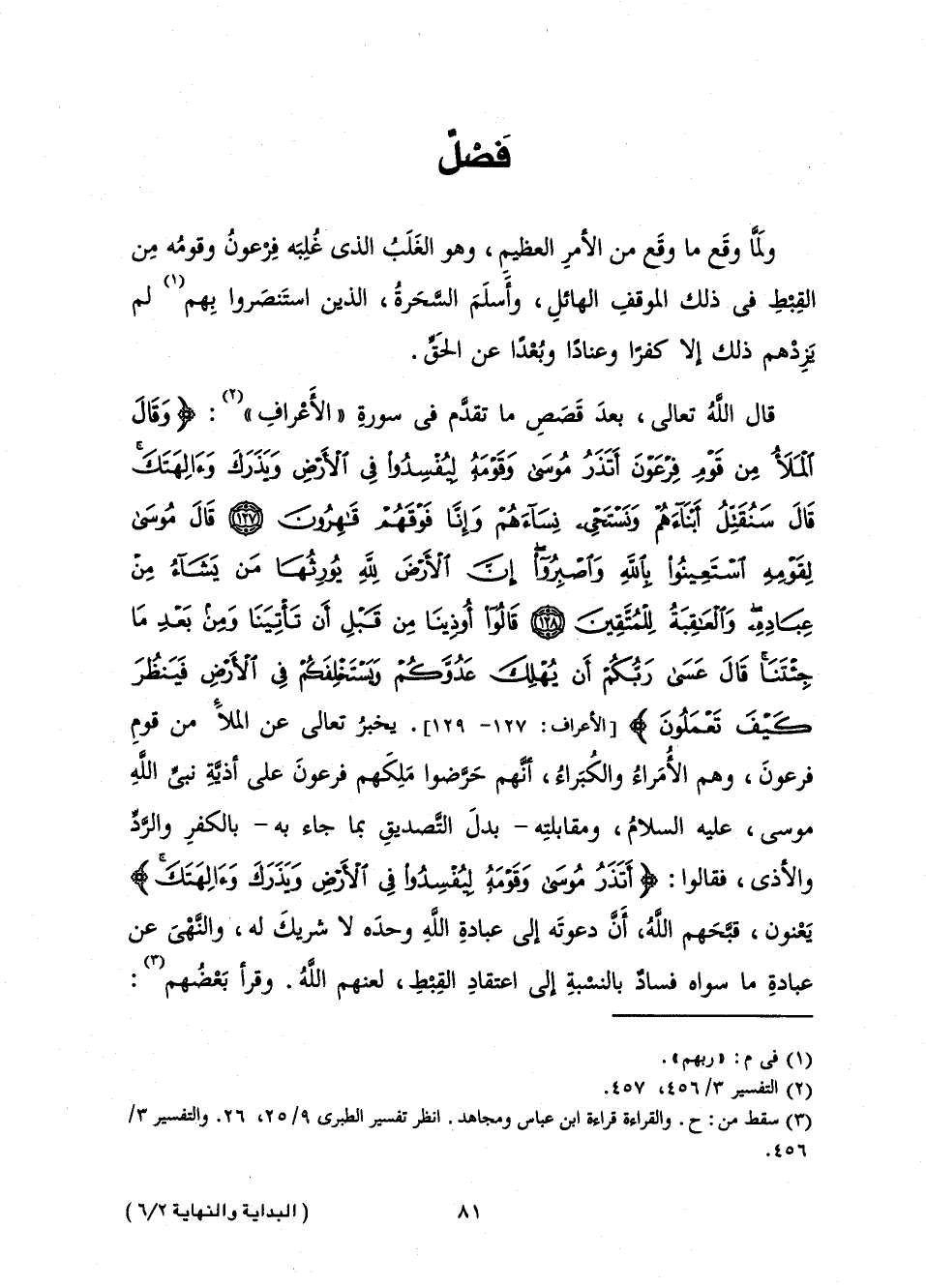 [الْأَعْرَافِ: 127 - 129] . يُخْبِرُ تَعَالَى عَنِ الْمَلَأِ مِنْ قَوْمِ فِرْعَوْنَ، وَهُمُ الْأُمَرَاءُ وَالْكُبَرَاءُ، أَنَّهُمْ حَرَّضُوا مِلَكَهُمْ فِرْعَوْنَ عَلَى أَذِيَّةِ نَبِيِّ اللَّهِ مُوسَى، عَلَيْهِ السَّلَامُ، وَمُقَابَلَتِهِ - بَدَلَ التَّصْدِيقِ بِمَا جَاءَ بِهِ - بِالْكُفْرِ وَالرَّدِّ وَالْأَذَى، فَقَالُوا {أَتَذَرُ مُوسَى وَقَوْمَهُ لِيُفْسِدُوا فِي الْأَرْضِ وَيَذَرَكَ وَآلِهَتَكَ} [الأعراف: 127] يَعْنُونَ، قَبَّحَهُمُ اللَّهُ، أَنَّ دَعْوَتَهُ إِلَى عِبَادَةِ اللَّهِ وَحْدَهُ لَا شَرِيكَ لَهُ، وَالنَّهْيَ عَنْ عِبَادَةِ مَا سِوَاهُ فَسَادٌ بِالنِّسْبَةِ إِلَى اعْتِقَادِ الْقِبْطِ، لَعَنَهُمُ اللَّهُ. وَقَرَأَ بَعْضُهُمْ: