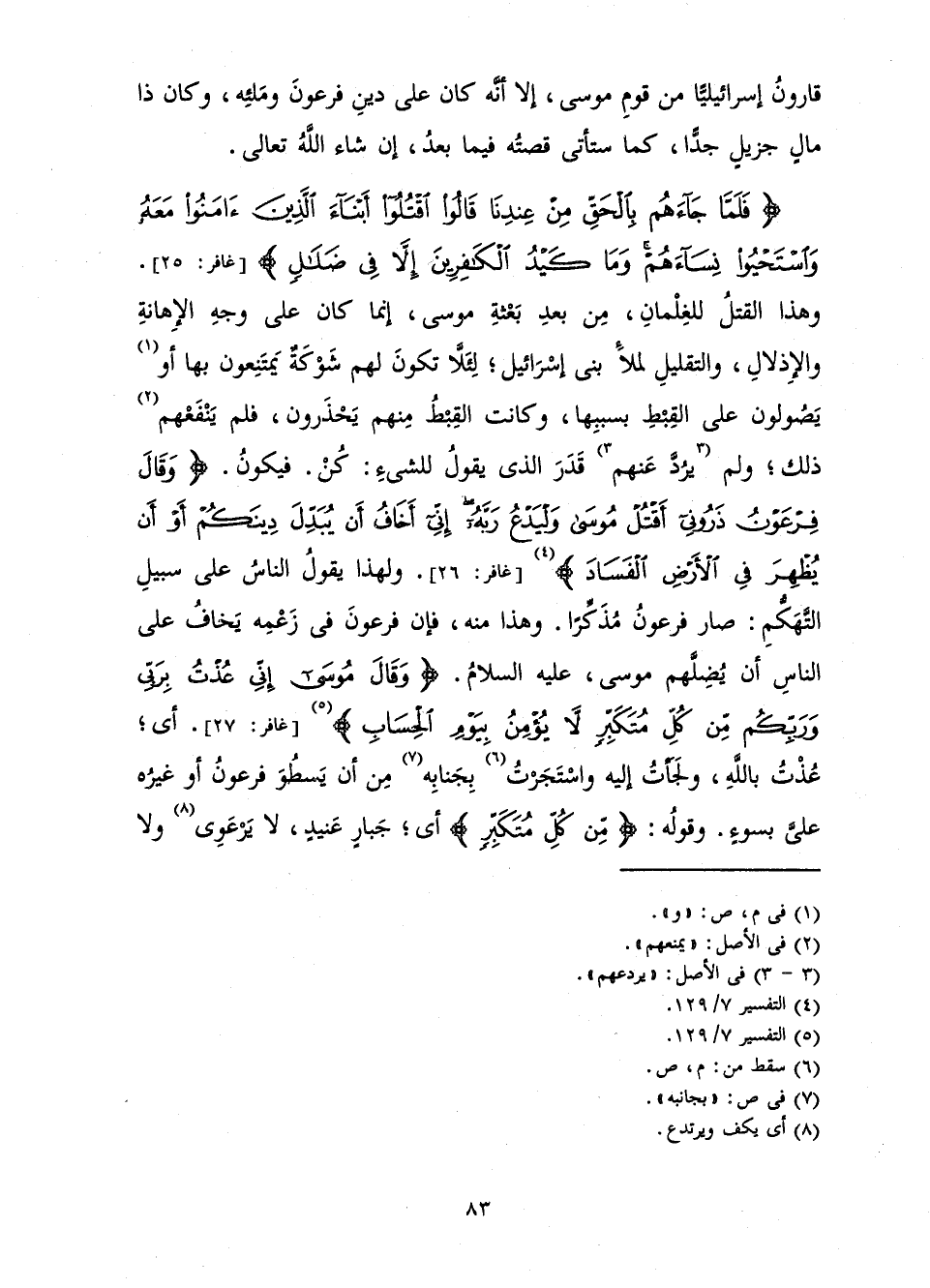 {فَلَمَّا جَاءَهُمْ بِالْحَقِّ مِنْ عِنْدِنَا قَالُوا اقْتُلُوا أَبْنَاءَ الَّذِينَ آمَنُوا مَعَهُ وَاسْتَحْيُوا نِسَاءَهُمْ وَمَا كَيْدُ الْكَافِرِينَ إِلَّا فِي ضَلَالٍ} [غافر: 25] . وَهَذَا الْقَتْلُ لِلْغِلْمَانِ، مِنْ بَعْدِ بَعْثَةِ مُوسَى، إِنَّمَا كَانَ عَلَى وَجْهِ الْإِهَانَةِ وَالْإِذْلَالِ، وَالتَّقْلِيلِ لِمَلَأِ بَنِي إِسْرَائِيلَ ; لِئَلَّا تَكُونَ لَهُمْ شَوْكَةٌ يَمْتَنِعُونَ بِهَا أَوْ يَصُولُونَ عَلَى الْقِبْطِ بِسَبَبِهَا، وَكَانَتِ الْقِبْطُ مِنْهُمْ يَحْذَرُونَ، فَلَمْ يَنْفَعْهُمْ ذَلِكَ ; وَلَمْ يَرُدَّ عَنْهُمْ قَدَرَ الَّذِي يَقُولُ لِلشَّيْءِ: كُنْ. فَيَكُونُ. {وَقَالَ فِرْعَوْنُ ذَرُونِي أَقْتُلْ مُوسَى وَلْيَدْعُ رَبَّهُ إِنِّي أَخَافُ أَنْ يُبَدِّلَ دِينَكُمْ أَوْ أَنْ يُظْهِرَ فِي الْأَرْضِ الْفَسَادَ} [غافر: 26] . وَلِهَذَا يَقُولُ النَّاسُ عَلَى سَبِيلِ التَّهَكُّمِ: صَارَ فِرْعَوْنُ مُذَكِّرًا. وَهَذَا مِنْهُ، فَإِنَّ فِرْعَوْنَ فِي زَعْمِهِ يَخَافُ عَلَى النَّاسِ أَنْ يُضِلَّهُمْ مُوسَى، عَلَيْهِ السَّلَامُ. {وَقَالَ مُوسَى إِنِّي عُذْتُ بِرَبِّي وَرَبِّكُمْ مِنْ كُلِّ مُتَكَبِّرٍ لَا يُؤْمِنُ بِيَوْمِ الْحِسَابِ} [غافر: 27] . أَيْ ; عُذْتُ بِاللَّهِ، وَلَجَأْتُ إِلَيْهِ وَاسْتَجَرْتُ بِجَنَابِهِ مِنْ أَنْ يَسْطُوَ فِرْعَوْنُ أَوْ غَيْرُهُ عَلَيَّ بِسُوءٍ. وَقَوْلُهُ: {مِنْ كُلِّ مُتَكَبِّرٍ} [غافر: 27] أَيْ ; جَبَّارٍ عَنِيدٍ، لَا يَرْعَوِي وَلَا