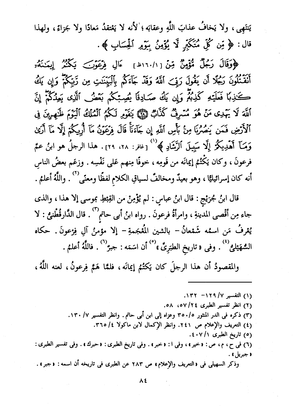 [غَافِرٍ: 28، 29] . هَذَا الرَّجُلُ هُوَ ابْنُ عَمِّ فِرْعَوْنَ، وَكَانَ يَكْتُمُ إِيمَانَهُ مِنْ قَوْمِهِ، خَوْفًا مِنْهُمْ عَلَى نَفْسِهِ. وَزَعَمَ بَعْضُ النَّاسِ أَنَّهُ كَانَ إِسْرَائِيلِيًّا، وَهُوَ بَعِيدٌ وَمُخَالِفٌ لِسِيَاقِ الْكَلَامِ لَفْظًا وَمَعْنًى. وَاللَّهُ أَعْلَمُ.