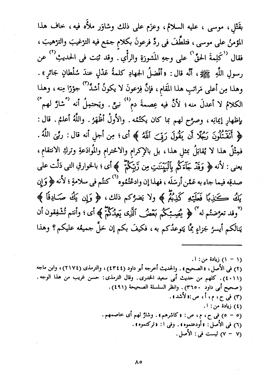 بِقَتْلِ مُوسَى، عَلَيْهِ السَّلَامُ، وَعَزَمَ عَلَى ذَلِكَ وَشَاوَرَ مَلَأَهُ فِيهِ، خَافَ هَذَا الْمُؤْمِنُ عَلَى مُوسَى، فَتَلَطَّفَ فِي رَدِّ فِرْعَوْنَ بِكَلَامٍ جَمَعَ فِيهِ التَّرْغِيبَ وَالتَّرْهِيبَ، فَقَالَ كَلِمَةَ الْحَقِّ عَلَى وَجْهِ الْمَشُورَةِ وَالرَّأْيِ. وَقَدْ ثَبَتَ فِي الْحَدِيثِ عَنْ رَسُولِ اللَّهِ صَلَّى اللَّهُ عَلَيْهِ وَسَلَّمَ، أَنَّهُ قَالَ: «أَفْضَلُ الْجِهَادِ كَلِمَةُ عَدْلٍ عِنْدَ سُلْطَانٍ جَائِرٍ» وَهَذَا مِنْ أَعْلَى مَرَاتِبِ هَذَا الْمَقَامِ، فَإِنَّ فِرْعَوْنَ لَا يَكُونُ أَشَدُّ جَوْرًا مِنْهُ، وَهَذَا الْكَلَامُ لَا أَعْدَلَ مِنْهُ; لِأَنَّ فِيهِ عِصْمَةَ دَمِ نَبِيٍّ. وَيُحْتَمَلُ أَنَّهُ أَشَارَ لَهُمْ بِإِظْهَارِ إِيمَانِهِ، وَصَرَّحَ لَهُمْ بِمَا كَانَ يَكْتُمُهُ. وَالْأَوَّلُ أَظْهَرُ. وَاللَّهُ أَعْلَمُ. قَالَ: {أَتَقْتُلُونَ رَجُلًا أَنْ يَقُولَ رَبِّيَ اللَّهُ} [غافر: 28] أَيْ; مِنْ أَجْلِ أَنَّهُ قَالَ: رَبِّيَ اللَّهُ. فَمِثْلُ هَذَا لَا يُقَابَلُ بِمِثْلِ هَذَا، بَلْ بِالْإِكْرَامِ وَالِاحْتِرَامِ وَالْمُوَادَعَةِ وَتَرَكِ الِانْتِقَامِ، يَعْنِي: لِأَنَّهُ {وَقَدْ جَاءَكُمْ بِالْبَيِّنَاتِ مِنْ رَبِّكُمْ} [غافر: 28] أَيْ; بِالْخَوَارِقِ الَّتِي دَلَّتْ عَلَى صَدْقِهِ فِيمَا جَاءَ بِهِ عَمَّنْ أَرْسَلَهُ فَهَذَا إِنْ وَادَعْتُمُوهُ كُنْتُمْ فِي سَلَامَةٍ; لِأَنَّهُ {وَإِنْ يَكُ كَاذِبًا فَعَلَيْهِ كَذِبُهُ} [غافر: 28] وَلَا يَضُرُّكُمْ ذَلِكَ {وَإِنْ يَكُ صَادِقًا} [غافر: 28] وَقَدْ تَعَرَّضْتُمْ لَهُ {يُصِبْكُمْ بَعْضُ الَّذِي يَعِدُكُمْ} [غافر: 28] أَيْ; وَأَنْتُمْ تُشْفِقُونَ أَنْ يَنَالَكُمْ أَيْسَرُ جَزَاءٍ مِمَّا يَتَوَعَّدُكُمْ بِهِ، فَكَيْفَ بِكُمْ إِنَّ حَلَّ جَمِيعُهُ عَلَيْكُمْ؟ وَهَذَا
