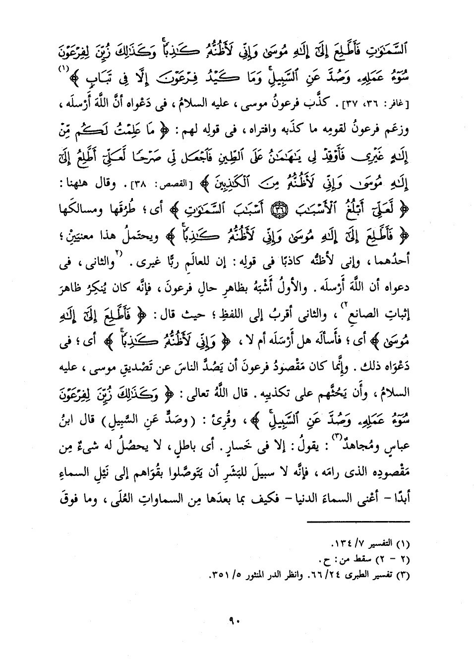 {وَقَالَ فِرْعَوْنُ يَا هَامَانُ ابْنِ لِي صَرْحًا لَعَلِّي أَبْلُغُ الْأَسْبَابَ - أَسْبَابَ السَّمَاوَاتِ فَأَطَّلِعَ إِلَى إِلَهِ مُوسَى وَإِنِّي لَأَظُنُّهُ كَاذِبًا وَكَذَلِكَ زُيِّنَ لِفِرْعَوْنَ سُوءُ عَمَلِهِ وَصُدَّ عَنِ السَّبِيلِ وَمَا كَيْدُ فِرْعَوْنَ إِلَّا فِي تَبَابٍ} [غافر: 36 - 37]