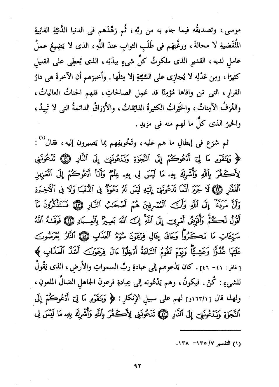 [غَافِرٍ: 41 - 46] . كَانَ يَدْعُوهُمْ إِلَى عِبَادَةِ رَبِّ السَّمَاوَاتِ وَالْأَرْضِ الَّذِي يَقُولُ لِلشَّيْءِ: كُنْ. فَيَكُونُ، وَهُمْ يَدْعُونَهُ إِلَى عِبَادَةِ فِرْعَوْنَ الْجَاهِلِ الضَّالِّ الْمَلْعُونِ، وَلِهَذَا قَالَ لَهُمْ عَلَى سَبِيلِ الْإِنْكَارِ: {وَيَا قَوْمِ مَا لِي أَدْعُوكُمْ إِلَى النَّجَاةِ وَتَدْعُونَنِي إِلَى النَّارِ - تَدْعُونَنِي لِأَكْفُرَ بِاللَّهِ وَأُشْرِكَ بِهِ مَا لَيْسَ لِي بِهِ عِلْمٌ وَأَنَا أَدْعُوكُمْ إِلَى الْعَزِيزِ الْغَفَّارِ} [غافر: 41 - 42] ،