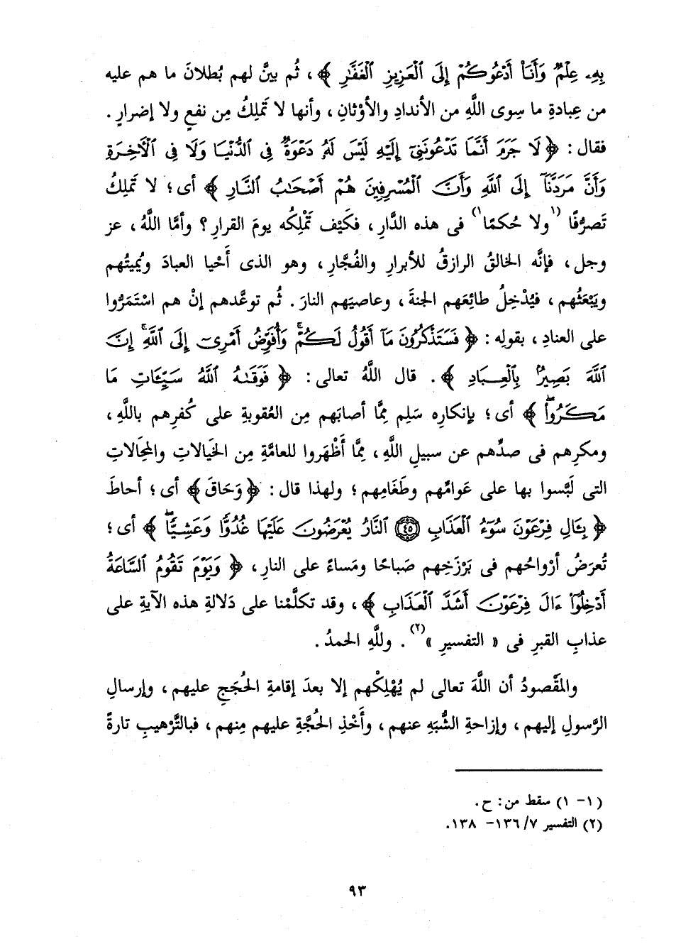 ثُمَّ بَيَّنَ لَهُمْ بُطْلَانَ مَا هُمْ عَلَيْهِ مِنْ عِبَادَةِ مَا سِوَى اللَّهِ مِنَ الْأَنْدَادِ وَالْأَوْثَانِ، وَأَنَّهَا لَا تَمْلِكُ مِنْ نَفْعٍ وَلَا إِضْرَارٍ. فَقَالَ: {لَا جَرَمَ أَنَّمَا تَدْعُونَنِي إِلَيْهِ لَيْسَ لَهُ دَعْوَةٌ فِي الدُّنْيَا وَلَا فِي الْآخِرَةِ وَأَنَّ مَرَدَّنَا إِلَى اللَّهِ وَأَنَّ الْمُسْرِفِينَ هُمْ أَصْحَابُ النَّارِ} [غافر: 43] أَيْ; لَا تَمْلِكُ تَصَرُّفًا وَلَا حُكْمًا فِي هَذِهِ الدَّارِ، فَكَيْفَ تَمْلِكُهُ يَوْمَ الْقَرَارِ؟ وَأَمَّا اللَّهُ عَزَّ وَجَلَّ فَإِنَّهُ الْخَالِقُ الرَّازِقُ لِلْأَبْرَارِ وَالْفُجَّارِ، وَهُوَ الَّذِي أَحْيَا الْعِبَادَ وَيُمِيتُهُمْ وَيَبْعَثُهُمْ، فَيُدْخِلُ طَائِعَهُمُ الْجَنَّةَ وَعَاصِيَهُمُ النَّارَ. ثُمَّ تَوَعَّدَهُمْ إِنْ هُمُ اسْتَمَرُّوا عَلَى الْعِنَادِ بِقَوْلِهِ: {فَسَتَذْكُرُونَ مَا أَقُولُ لَكُمْ وَأُفَوِّضُ أَمْرِي إِلَى اللَّهِ إِنَّ اللَّهَ بَصِيرٌ بِالْعِبَادِ} [غافر: 44] قَالَ اللَّهُ تَعَالَى: {فَوَقَاهُ اللَّهُ سَيِّئَاتِ مَا مَكَرُوا} [غافر: 45] أَيْ; بِإِنْكَارِهِ سَلِمَ مِمَّا أَصَابَهُمْ مِنَ الْعُقُوبَةِ عَلَى كُفْرِهِمْ بِاللَّهِ، وَمَكْرِهِمْ فِي صَدِّهِمْ عَنْ سَبِيلِ اللَّهِ مِمَّا أَظْهَرُوا لِلْعَامَّةِ مِنَ الْخَيَالَاتِ وَالْمُحَالَاتِ الَّتِي لَبَّسُوا بِهَا عَلَى عَوَامِّهِمْ وَطَغَامِهِمْ; وَلِهَذَا قَالَ: وَحَاقَ أَيْ; أَحَاطَ {بِآلِ فِرْعَوْنَ سُوءُ الْعَذَابِ - النَّارُ يُعْرَضُونَ عَلَيْهَا غُدُوًّا وَعَشِيًّا} [غافر: 45 - 46] أَيْ; تُعْرَضُ أَرْوَاحُهُمْ فِي بَرْزَخِهِمْ صَبَاحًا وَمَسَاءً عَلَى النَّارِ، {وَيَوْمَ تَقُومُ السَّاعَةُ أَدْخِلُوا آلَ فِرْعَوْنَ أَشَدَّ الْعَذَابِ} [غافر: 46] وَقَدْ تَكَلَّمْنَا عَلَى دَلَالَةِ هَذِهِ الْآيَةِ عَلَى عَذَابِ الْقَبْرِ فِي " التَّفْسِيرِ ". وَلِلَّهِ الْحَمْدُ.