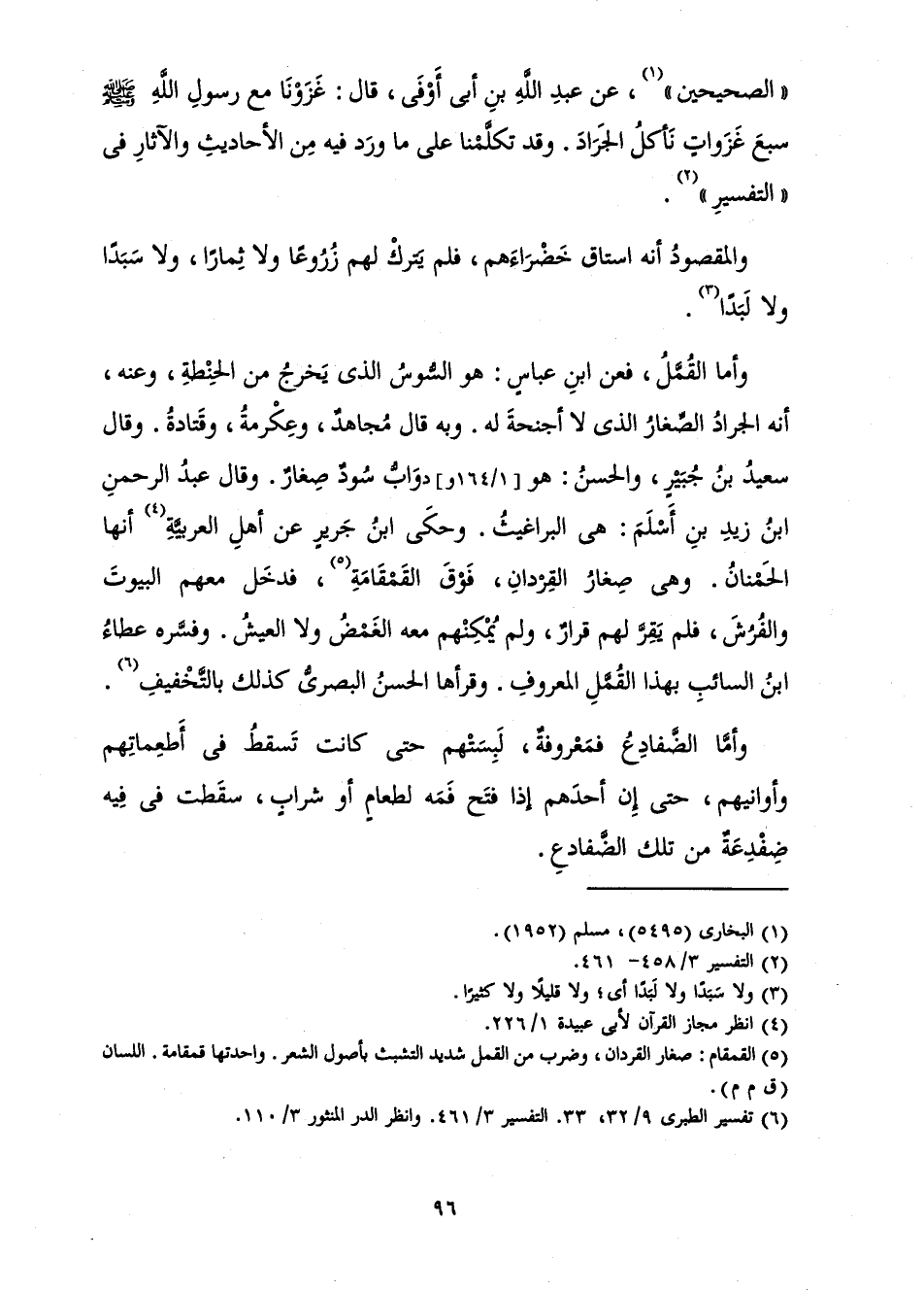 " الصَّحِيحَيْنِ "، عَنْ عَبْدِ اللَّهِ بْنِ أَبِي أَوْفَى، قَالَ: «غَزْونَا مَعَ رَسُولِ اللَّهِ صَلَّى اللَّهُ عَلَيْهِ وَسَلَّمَ سَبْعَ غَزَوَاتٍ نَأْكُلُ الْجَرَادَ» . وَقَدْ تَكَلَّمْنَا عَلَى مَا وَرَدَ فِيهِ مِنَ الْأَحَادِيثِ وَالْآثَارِ فِي " التَّفْسِيرِ ".