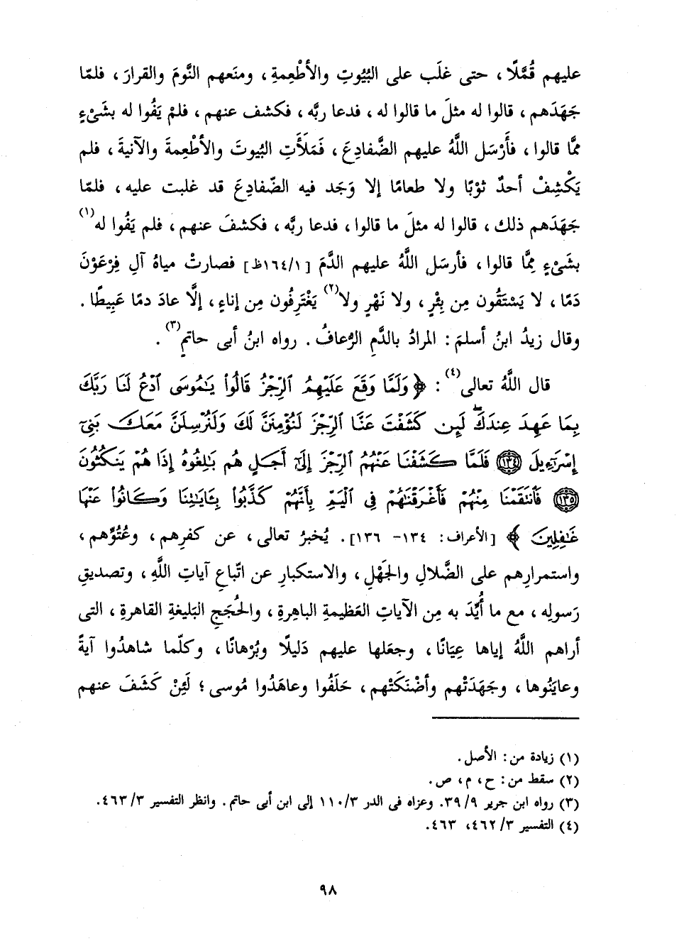 قَالَ اللَّهُ تَعَالَى: {وَلَمَّا وَقَعَ عَلَيْهِمُ الرِّجْزُ قَالُوا يَا مُوسَى ادْعُ لَنَا رَبَّكَ بِمَا عَهِدَ عِنْدَكَ لَئِنْ كَشَفْتَ عَنَّا الرِّجْزَ لَنُؤْمِنَنَّ لَكَ وَلَنُرْسِلَنَّ مَعَكَ بَنِي إِسْرَائِيلَ - فَلَمَّا كَشَفْنَا عَنْهُمُ الرِّجْزَ إِلَى أَجَلٍ هُمْ بَالِغُوهُ إِذَا هُمْ يَنْكُثُونَ - فَانْتَقَمْنَا مِنْهُمْ فَأَغْرَقْنَاهُمْ فِي الْيَمِّ بِأَنَّهُمْ كَذَّبُوا بِآيَاتِنَا وَكَانُوا عَنْهَا غَافِلِينَ} [الأعراف: 134 - 136]