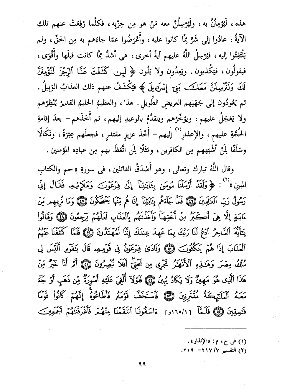 وَقَالَ اللَّهُ تَبَارَكَ وَتَعَالَى، وَهُوَ أَصْدَقُ الْقَائِلِينَ فِي سُورَةِ " حم وَالْكِتَابِ الْمُبِينِ ": {وَلَقَدْ أَرْسَلْنَا مُوسَى بِآيَاتِنَا إِلَى فِرْعَوْنَ وَمَلَئِهِ فَقَالَ إِنِّي رَسُولُ رَبِّ الْعَالَمِينَ - فَلَمَّا جَاءَهُمْ بِآيَاتِنَا إِذَا هُمْ مِنْهَا يَضْحَكُونَ - وَمَا نُرِيهِمْ مِنْ آيَةٍ إِلَّا هِيَ أَكْبَرُ مِنْ أُخْتِهَا وَأَخَذْنَاهُمْ بِالْعَذَابِ لَعَلَّهُمْ يَرْجِعُونَ - وَقَالُوا يَا أَيُّهَا السَّاحِرُ ادْعُ لَنَا رَبَّكَ بِمَا عَهِدَ عِنْدَكَ إِنَّنَا لَمُهْتَدُونَ - فَلَمَّا كَشَفْنَا عَنْهُمُ الْعَذَابَ إِذَا هُمْ يَنْكُثُونَ - وَنَادَى فِرْعَوْنُ فِي قَوْمِهِ قَالَ يَا قَوْمِ أَلَيْسَ لِي مُلْكُ مِصْرَ وَهَذِهِ الْأَنْهَارُ تَجْرِي مِنْ تَحْتِي أَفَلَا تُبْصِرُونَ - أَمْ أَنَا خَيْرٌ مِنْ هَذَا الَّذِي هُوَ مَهِينٌ وَلَا يَكَادُ يُبِينُ - فَلَوْلَا أُلْقِيَ عَلَيْهِ أَسْوِرَةٌ مِنْ ذَهَبٍ أَوْ جَاءَ مَعَهُ الْمَلَائِكَةُ مُقْتَرِنِينَ - فَاسْتَخَفَّ قَوْمَهُ فَأَطَاعُوهُ إِنَّهُمْ كَانُوا قَوْمًا فَاسِقِينَ - فَلَمَّا آسَفُونَا انْتَقَمْنَا مِنْهُمْ فَأَغْرَقْنَاهُمْ أَجْمَعِينَ - فَجَعَلْنَاهُمْ سَلَفًا وَمَثَلًا لِلْآخِرِينَ} [الزخرف: 46 - 56]