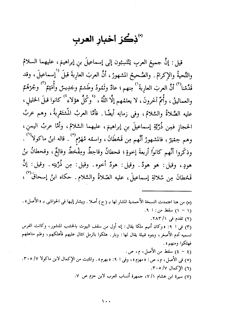 قِيلَ: إِنَّ جَمِيعَ الْعَرَبِ يَنْتَسِبُونَ إِلَى إِسْمَاعِيلَ بْنِ ابْرَاهِيمَ عَلَيْهِمَا السَّلَامُ وَالتَّحِيَّةُ وَالْإِكْرَامُ. وَالصَّحِيحُ الْمَشْهُورُ أَنَّ الْعَرَبَ الْعَارِبَةَ قَبْلَ إِسْمَاعِيلَ، وَقَدْ قَدَّمْنَا أَنَّ الْعَرَبَ الْعَارِبَةَ مِنْهُمْ عَادٌ وَثَمُودُ وَطَسْمٌ وَجَدِيسٌ وَأَمِيمٌ وَجُرْهُمٌ وَالْعَمَالِيقُ، وَأُمَمٌ آخَرُونَ لَا يَعْلَمُهُمْ إِلَّا اللَّهُ. وَكُلُّ هَؤُلَاءِ كَانُوا قَبْلَ الْخَلِيلِ عَلَيْهِ الصَّلَاةُ وَالسَّلَامُ، وَفِي زَمَانِهِ أَيْضًا فَأَمَّا الْعَرَبُ الْمُسْتَعْرِبَةُ ; وَهُمْ عَرَبُ الْحِجَازِ فَمِنْ ذُرِّيَّةِ إِسْمَاعِيلَ بْنِ ابْرَاهِيمَ عَلَيْهِمَا السَّلَامُ، وَأَمَّا عَرَبُ الْيَمَنِ ; وَهُمْ حِمْيَرُ فَالْمَشْهُورُ أَنَّهُمْ مِنْ قَحْطَانَ وَاسْمُهُ مُهَرِّمٌ. قَالَهُ ابْنُ مَاكُولَا. وَذَكَرُوا أَنَّهُمْ كَانُوا أَرْبَعَةَ إِخْوَةٍ ; قَحْطَانُ وَقَاحِطٌ وَمِقْحَطٌ وَفَالِغٌ وَقَحْطَانُ بْنُ هُودٍ، وَقِيلَ: هُوَ هُودٌ، وَقِيلَ: هُودٌ أَخُوهُ، وَقِيلَ: مِنْ ذُرِّيَّتِهِ، وَقِيلَ: إِنَّ قَحْطَانَ مِنْ سُلَالَةِ إِسْمَاعِيلُ عَلَيْهِ الصَّلَاةُ وَالسَّلَامُ حَكَاهُ ابْنُ إِسْحَاقَ