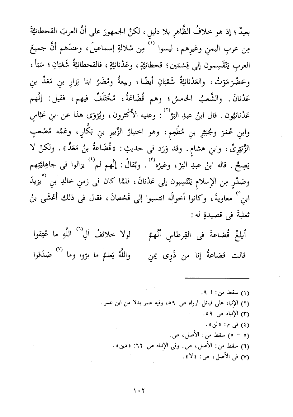 بِعِيدٌ ; إِذْ هُوَ خِلَافُ الظَّاهِرِ بِلَا دَلِيلٍ، لَكِنَّ الْجُمْهُورَ عَلَى أَنَّ الْعَرَبَ الْقَحْطَانِيَّةَ مِنْ عَرَبِ الْيَمَنِ وَغَيْرِهِمْ لَيْسُوا مِنْ سُلَالَةِ إِسْمَاعِيلَ، وَعِنْدَهُمْ أَنَّ جَمِيعَ الْعَرَبِ يَنْقَسِمُونَ إِلَى قِسْمَيْنِ: قَحْطَانِيَّةٍ وَعَدْنَانِيَّةٍ فَالْقَحْطَانِيَّةُ شَعْبَانِ: سَبَأٌ وَحَضْرَمَوْتُ وَالْعَدْنَانِيَّةُ شَعْبَانِ أَيْضًا: رَبِيعَةُ وَمُضَرُ ابْنًا نِزَارِ بْنِ مَعَدِّ بْنِ عَدْنَانَ، وَالشَّعْبُ الْخَامِسُ وَهُمْ قُضَاعَةُ مُخْتَلَفٌ فِيهِمْ فَقِيلَ: إِنَّهُمْ عَدْنَانِيُّونَ قَالَ ابْنُ عَبْدِ الْبَرِّ: وَعَلَيْهِ الْأَكْثَرُونَ. وَيُرْوَى هَذَا عَنِ ابْنِ عَبَّاسٍ وَابْنِ عُمَرَ وَجُبَيْرِ بْنِ مَطْعِمٍ، وَهُوَ اخْتِيَارُ الزُّبَيْرِ بْنِ بَكَّارٍ وَعَمِّهِ مُصْعَبِ الزُّبَيْرِيِّ، وَابْنِ هِشَامٍ. وَقَدْ وَرَدَ فِي حَدِيثِ " قُضَاعَةَ بْنِ مَعَدٍّ "، وَلَكِنْ لَا يَصِحُّ قَالَهُ ابْنُ عَبْدِ الْبَرِّ وَغَيْرُهُ، وَيُقَالَ: إِنَّهُمْ لَمْ يَزَالُوا فِي جَاهِلِيَّتِهِمْ، وَصَدْرٍ مِنَ الْإِسْلَامِ يَنْتَسِبُونَ إِلَى عَدْنَانَ فَلَمَّا كَانَ فِي زَمَنِ خَالِدِ بْنِ يَزِيدَ بْنِ مُعَاوِيَةَ كَانُوا أَخْوَالَهُ انْتَسَبُوا إِلَى قَحْطَانَ فَقَالَ فِي ذَلِكَ أَعْشَى بْنُ ثَعْلَبَةَ فِي قَصِيدَةٍ لَهُ.