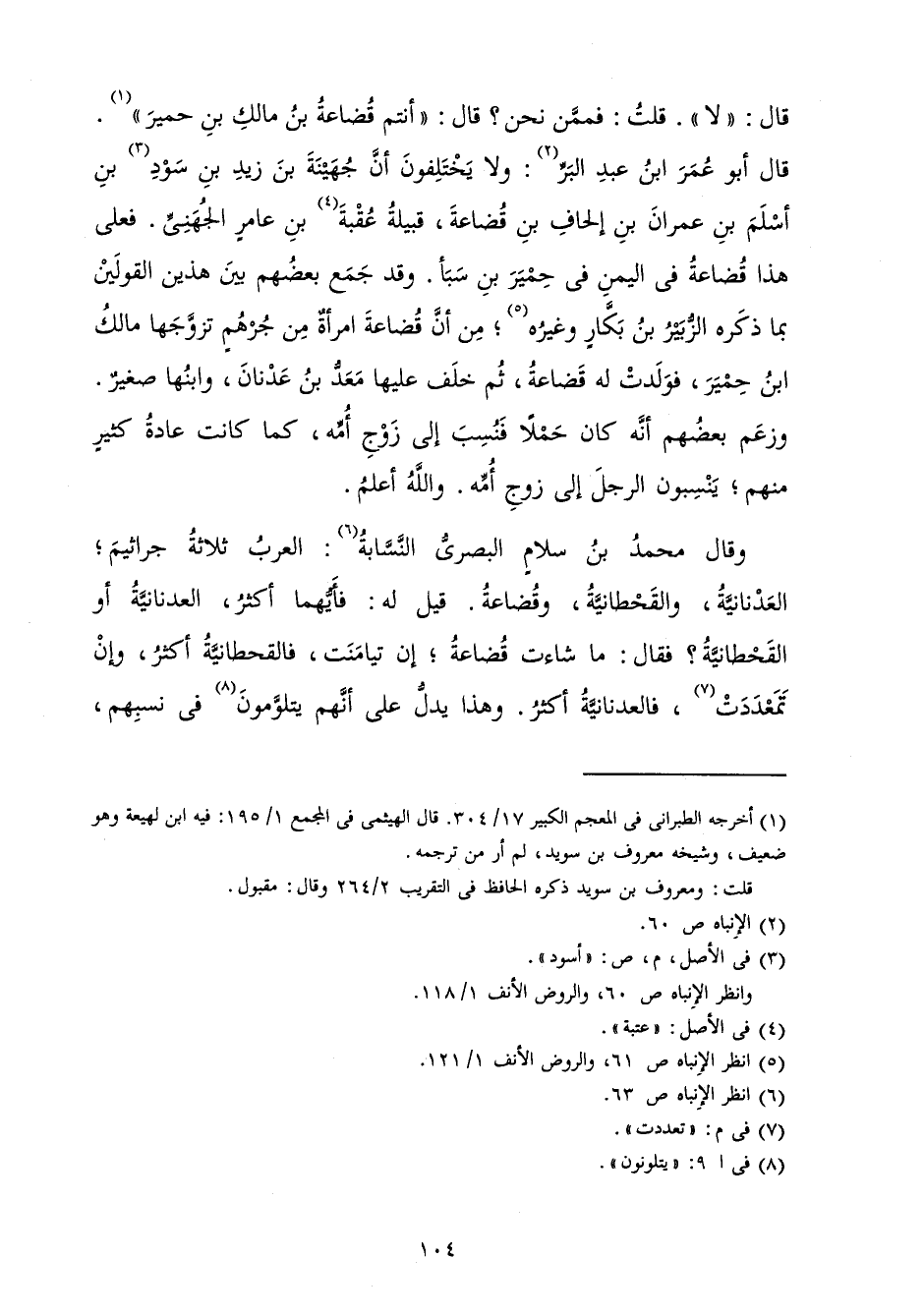 قَالَ: لَا. قُلْتُ: فَمِمَّنْ نَحْنُ؟ قَالَ: أَنْتُمْ قُضَاعَةُ بْنُ مَالِكِ بْنِ حِمْيَرَ» قَالَ أَبُو عُمَرَ ابْنُ عَبْدِ الْبَرِّ: وَلَا يَخْتَلِفُونَ أَنَّ جُهَيْنَةَ بْنَ زَيْدِ بْنِ سُودِ بْنِ أَسْلَمَ بْنِ عِمْرَانَ بْنِ الْحَافَ بْنِ قُضَاعَةَ، قَبِيلَةُ عُقْبَةَ بْنِ عَامِرٍ الْجُهَنِيِّ ; فَعَلَى هَذَا قُضَاعَةُ فِي الْيَمَنِ فِي حِمْيَرَ بْنِ سَبَأٍ. وَقَدْ جَمَعَ بَعْضُهُمْ بَيْنَ هَذَيْنَ الْقَوْلَيْنِ بِمَا ذَكَرَهُ الزُّبَيْرُ بْنُ بَكَّارٍ وَغَيْرُهُ; مِنْ أَنَّ قُضَاعَةَ امْرَأَةٌ مِنْ جُرْهُمٍ تَزَوَّجَهَا مَالِكُ بْنُ حِمْيَرَ فَوَلَدَتْ لَهُ قُضَاعَةَ، ثُمَّ خَلَّفَ عَلَيْهَا مَعَدُّ بْنُ عَدْنَانَ - وَابْنُهَا صَغِيرٌ وَزَعَمَ بَعْضُهُمْ أَنَّهُ كَانَ حَمْلًا - فَنُسِبَ إِلَى زَوْجِ أُمِّهِ، كَمَا كَانَتْ عَادَةُ كَثِيرٍ مِنْهُمْ يَنْسُبُونَ الرَّجُلَ إِلَى زَوْجِ أُمِّهِ. وَاللَّهُ أَعْلَمُ.