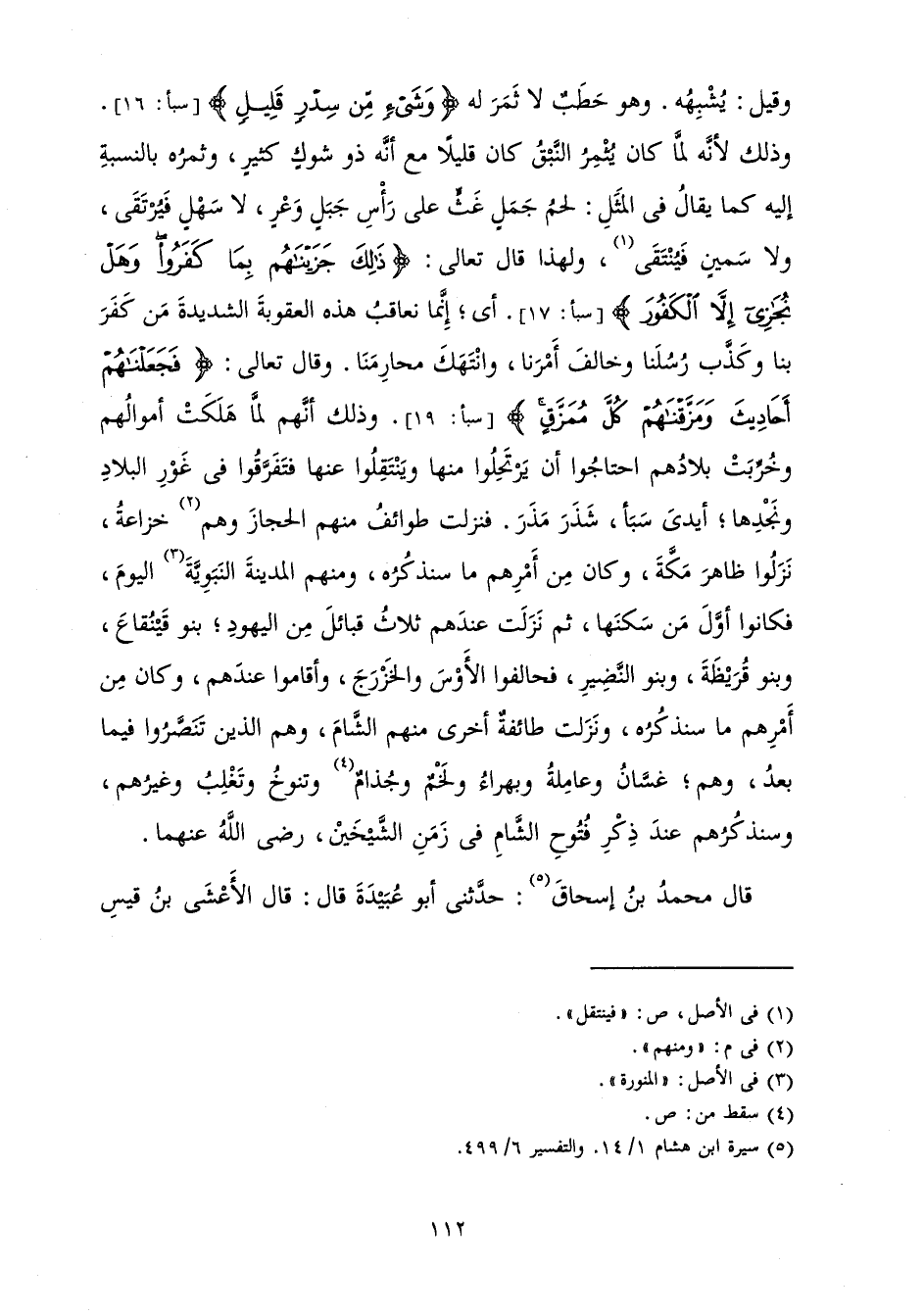وَقِيلَ: يُشْبِهُهُ وَهُوَ حَطَبٌ لَا ثَمَرَ لَهُ {وَشَيْءٍ مِنْ سِدْرٍ قَلِيلٍ} [سبأ: 16] وَذَلِكَ لِأَنَّهُ لَمَّا كَانَ يُثْمِرُ النَّبْقُ كَانَ قَلِيلًا مَعَ أَنَّهُ ذُو شَوْكٍ كَثِيرٍ، وَثَمَرُهُ بِالنِّسْبَةِ إِلَيْهِ كَمَا يُقَالَ فِي الْمَثَلِ: لَحْمُ جَمَلٍ غَثٍّ عَلَى رَأْسِ جَبَلٍ وَعْرٍ لَا سَهْلَ فَيُرْتَقَى وَلَا سَمِينَ فَيُنْتَقَى; وَلِهَذَا قَالَ تَعَالَى {ذَلِكَ جَزَيْنَاهُمْ بِمَا كَفَرُوا وَهَلْ نُجَازِي إِلَّا الْكَفُورَ} [سبأ: 17] أَيْ: إِنَّمَا نُعَاقِبُ هَذِهِ الْعُقُوبَةَ الشَّدِيدَةَ مَنْ كَفَرَ بِنَا وَكَذَّبَ رُسُلَنَا، وَخَالَفَ أَمْرَنَا، وَانْتَهَكَ مَحَارِمَنَا، وَقَالَ تَعَالَى {فَجَعَلْنَاهُمْ أَحَادِيثَ وَمَزَّقْنَاهُمْ كُلَّ مُمَزَّقٍ} [سبأ: 19] وَذَلِكَ أَنَّهُمْ لَمَّا هَلَكَتْ أَمْوَالُهُمْ، وَخَرِبَتْ بِلَادُهُمُ احْتَاجُوا أَنْ يَرْتَحِلُوا مِنْهَا، وَيَنْتَقِلُوا عَنْهَا فَتَفَرَّقُوا فِي غَوْرِ الْبِلَادِ وَنَجْدِهَا ; أَيْدِيَ سَبَأٍ شَذَرَ مَذَرَ فَنَزَلَتْ طَوَائِفُ مِنْهُمُ الْحِجَازَ، وَهُمْ خُزَاعَةُ نَزَلُوا ظَاهِرِ مَكَّةَ وَكَانَ مِنْ أَمْرِهِمْ مَا سَنَذْكُرُهُ، وَمِنْهُمُ الْمَدِينَةَ النَّبَوِيَّةَ الْيَوْمَ فَكَانُوا أَوَّلَ مَنْ سَكَنَهَا، ثُمَّ نَزَلَتْ عِنْدَهُمْ ثَلَاثُ قَبَائِلَ مِنَ الْيَهُودِ; بَنُو قَيْنُقَاعَ، وَبَنُو قُرَيْظَةَ، وَبَنُو النَّضِيرِ فَحَالَفُوا الْأَوْسَ وَالْخَزْرَجَ وَأَقَامُوا عِنْدَهُمْ وَكَانَ مِنْ أَمْرِهِمْ مَا سَنَذْكُرُهُ، وَنَزَلَتْ طَائِفَةٌ أُخْرَى مِنْهُمُ الشَّامَ، وَهُمُ الَّذِينَ تَنَصَّرُوا فِيمَا بَعْدُ، وَهُمْ غَسَّانُ وَعَامِلَةُ وَبَهْرَاءُ وَلَخْمٌ وَجُذَامٌ وَتَنُوخُ وَتَغْلِبُ وَغَيْرُهُمْ، وَسَنَذْكُرُهُمْ عِنْدَ ذِكْرِ فُتُوحِ الشَّامِ فِي زَمَنِ الشَّيْخَيْنِ رَضِيَ اللَّهُ عَنْهُمَا.