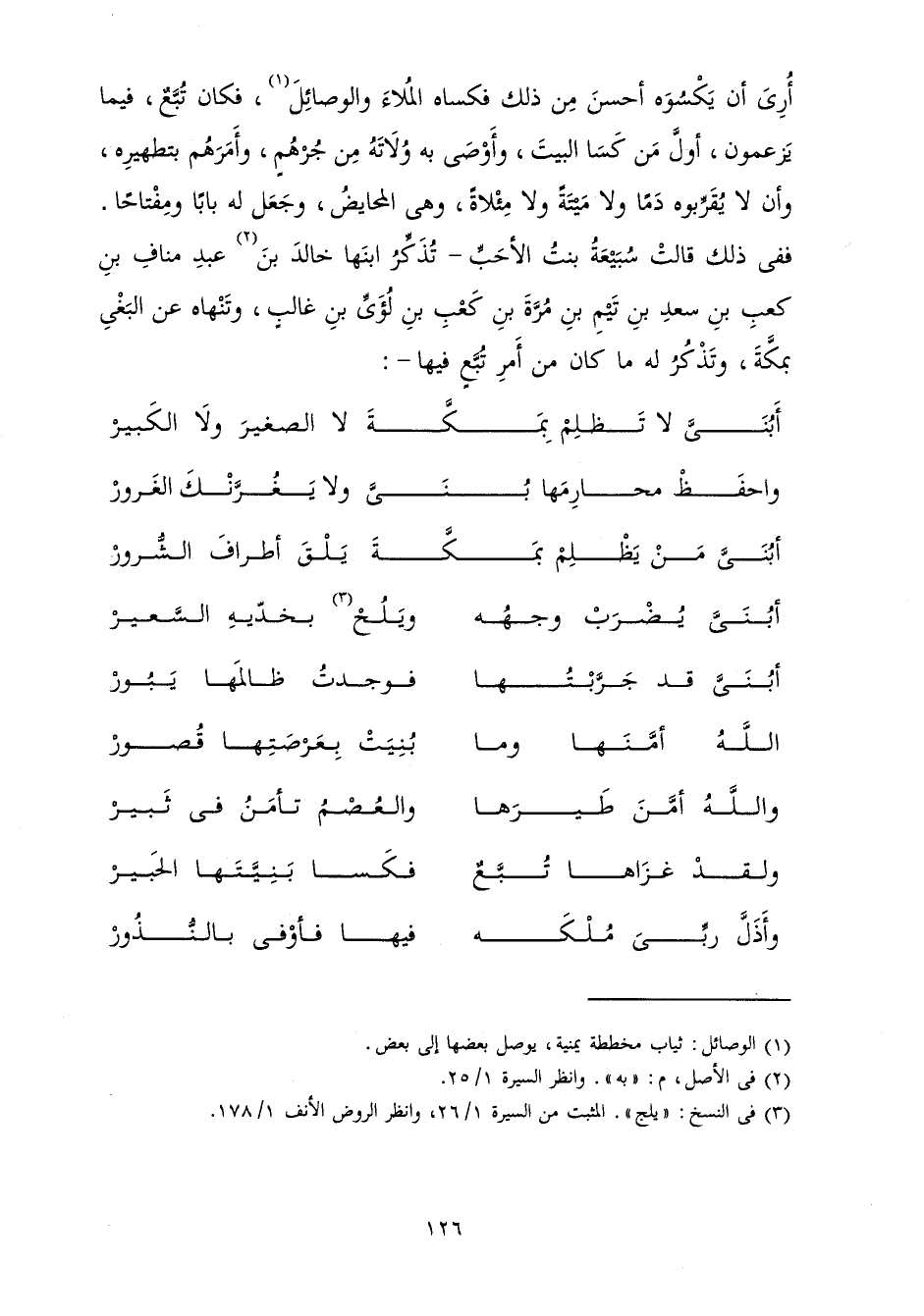 أُرِيَ أَنْ يَكْسُوَهُ أَحْسَنَ مِنْ ذَلِكَ فَكَسَاهُ الْمُلَاءَ وَالْوَصَائِلَ فَكَانَ تُبَّعٌ فِيمَا يَزْعُمُونَ أَوَّلَ مَنْ كَسَا الْبَيْتَ، وَأَوْصَى بِهِ وُلَاتَهُ مِنْ جُرْهُمٍ وَأَمَرَهُمْ بِتَطْهِيرِهِ، وَأَنْ لَا يُقَرِّبُوهُ دَمًا وَلَا مَيْتَةً وَلَا مِئْلَاةً وَهِيَ الْمَحَايِضُ، وَجَعَلَ لَهُ بَابًا، وَمِفْتَاحًا فَفِي ذَلِكَ قَالَتْ سُبَيْعَةُ بِنْتُ الْأَحَبِّ - تُذَكِّرُ ابْنَهَا خَالِدَ بْنَ عَبْدِ مَنَافِ بْنِ كَعْبِ بْنِ سَعْدِ بْنِ تَيْمِ بْنِ مُرَّةَ بْنِ كَعْبِ بْنِ لُؤَيِّ بْنِ غَالِبٍ، وَتَنْهَاهُ عَنِ الْبَغْيِ بِمَكَّةَ، وَتَذْكُرُ لَهُ مَا كَانَ مِنْ أَمْرِ تُبَّعٍ فِيهَا -: