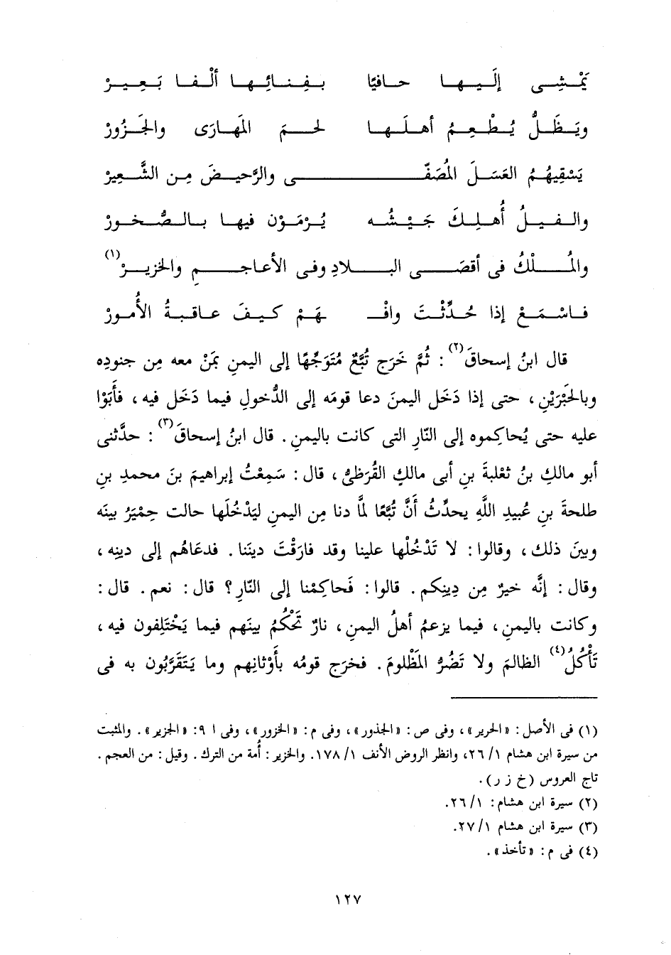 فَاسْمَعْ إِذَا حُدِّثْتَ وَافْهَمْ كَيْفَ عَاقِبَةُ الْأُمُورِ قَالَ ابْنُ إِسْحَاقَ: ثُمَّ خَرَجَ تُبَّعٌ مُتَوَجِّهًا إِلَى الْيَمَنِ بِمَنْ مَعَهُ مِنْ جُنُودِهِ، وَبِالْحَبْرَيْنِ حَتَّى إِذَا دَخَلَ الْيَمَنَ دَعَا قَوْمَهُ إِلَى الدُّخُولِ فِيمَا دَخَلَ فِيهِ فَأَبَوْا عَلَيْهِ حَتَّى يُحَاكِمُوهُ إِلَى النَّارِ الَّتِي كَانَتْ بِالْيَمَنِ. قَالَ ابْنُ إِسْحَاقَ حَدَّثَنِي أَبُو مَالِكِ بْنُ ثَعْلَبَةَ بْنِ أَبِي مَالِكٍ الْقُرَظِيُّ قَالَ سَمِعْتُ ابْرَاهِيمَ بْنَ مُحَمَّدِ بْنِ طَلْحَةَ بْنِ عُبَيْدِ اللَّهِ يُحَدِّثُ أَنَّ تُبَّعًا لَمَّا دَنَا مِنَ الْيَمَنِ لِيَدْخُلَهَا حَالَتْ حِمْيَرُ بَيْنَهُ وَبَيْنَ ذَلِكَ، وَقَالُوا: لَا تَدْخُلْهَا عَلَيْنَا، وَقَدْ فَارَقْتَ دِينَنَا فَدَعَاهُمْ إِلَى دِينِهِ، وَقَالَ: إِنَّهُ خَيْرٌ مِنْ دِينِكُمْ قَالُوا: فَحَاكِمْنَا إِلَى النَّارِ؟ قَالَ: نَعَمْ قَالَ: وَكَانَتْ بِالْيَمَنِ فِيمَا يَزْعُمُ أَهْلُ الْيَمَنِ نَارٌ تَحْكُمُ بَيْنَهُمْ فِيمَا يَخْتَلِفُونَ فِيهِ تَأْكُلُ الظَّالِمَ وَلَا تَضُرُّ الْمَظْلُومَ فَخَرَجَ قَوْمُهُ بِأَوْثَانِهِمْ وَمَا يَتَقَرَّبُونَ بِهِ فِي