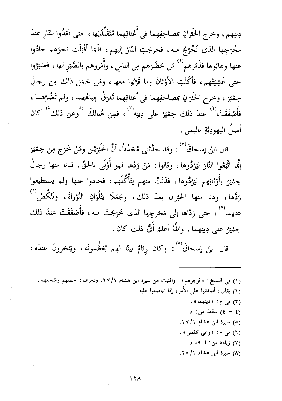 قَالَ ابْنُ إِسْحَاقَ: وَقَدْ حَدَّثَنِي مُحَدِّثٌ أَنَّ الْحَبْرَيْنِ، وَمَنْ خَرَجَ مِنْ حِمْيَرَ إِنَّمَا اتَّبَعُوا النَّارَ لِيَرُدُّوهَا، وَقَالُوا: مَنْ رَدَّهَا فَهُوَ أَوْلَى بِالْحَقِّ فَدَنَا مِنْهَا رِجَالُ حِمْيَرَ بِأَوْثَانِهِمْ لِيَرُدُّوهَا فَدَنَتْ مِنْهُمْ لِتَأْكُلَهُمْ فَحَادُوا عَنْهَا، وَلَمْ يَسْتَطِيعُوا رَدَّهَا، وَدَنَا مِنْهَا الْحَبْرَانِ بَعْدَ ذَلِكَ، وَجَعَلَا يَتْلُوَانِ التَّوْرَاةَ، وَتَنْكِصُ عَنْهُمَا حَتَّى رَدَّاهَا إِلَى مَخْرَجِهَا الَّذِي خَرَجَتْ مِنْهُ فَأَصْفَقَتْ عِنْدَ ذَلِكَ حِمْيَرُ عَلَى دِينِهِمَا. وَاللَّهُ أَعْلَمُ أَيُّ ذَلِكَ كَانَ.