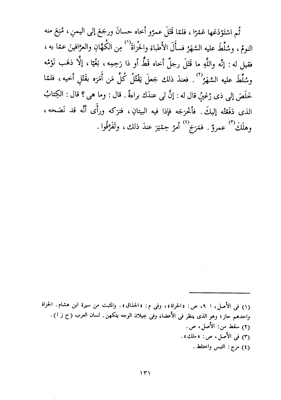 ثُمَّ اسْتَوْدَعَهَا عَمْرًا فَلَمَّا قَتَلَ عَمْرٌو أَخَاهُ حَسَّانَ، وَرَجَعَ إِلَى الْيَمَنِ مُنِعَ مِنْهُ النَّوْمُ، وَسُلِّطَ عَلَيْهِ السَّهَرُ فَسَأَلَ الْأَطِبَّاءَ وَالْحُزَاةَ مِنَ الْكُهَّانِ وَالْعَرَّافِينَ عَمَّا بِهِ فَقِيلَ لَهُ: إِنَّهُ وَاللَّهِ مَا قَتَلَ رَجُلٌ أَخَاهُ قَطُّ أَوْ ذَا رَحِمَهُ بَغْيًا إِلَّا ذَهَبَ نَوْمُهُ، وَسُلِّطَ عَلَيْهِ السَّهَرُ فَعِنْدَ ذَلِكَ جَعَلَ يَقْتُلُ كُلَّ مَنْ أَمَرَهُ بِقَتْلِ أَخِيهِ فَلَمَّا خَلُصَ إِلَى ذِي رُعَيْنٍ قَالَ لَهُ: إِنَّ لِي عِنْدَكَ بَرَاءَةً قَالَ: وَمَا هِيَ؟ قَالَ: الْكِتَابُ الَّذِي دَفَعْتُهُ الَيْكَ فَأَخْرَجَهُ فَاذَا فِيهِ الْبَيْتَانِ فَتَرَكَهُ، وَرَأَى أَنَّهُ قَدْ نَصَحَهُ، وَهَلَكَ عَمْرٌو فَمَرَجَ أَمْرُ حِمْيَرَ عِنْدَ ذَلِكَ، وَتَفَرَّقُوا.