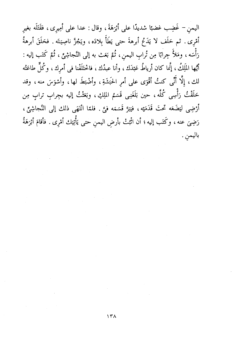 الْيَمَنِ غَضِبَ غَضَبًا شَدِيدًا عَلَى أَبْرَهَةَ، وَقَالَ: عَدَا عَلَى أَمِيرِي فَقَتَلَهُ بِغَيْرِ أَمْرِي، ثُمَّ حَلَفَ لَا يَدَعُ أَبْرَهَةَ حَتَّى يَطَأَ بِلَادَهُ، وَيَجُزَّ نَاصِيَتَهُ فَحَلَقَ أَبْرَهَةُ رَأْسَهُ، وَمَلَأَ جِرَابًا مِنْ تُرَابِ الْيَمَنِ، ثُمَّ بَعَثَ بِهِ إِلَى النَّجَاشِيِّ، ثُمَّ كَتَبَ إِلَيْهِ: أَيُّهَا الْمَلِكُ إِنَّمَا كَانَ أَرْيَاطُ عَبْدَكَ، وَأَنَا عَبْدُكَ فَاخْتَلَفْنَا فِي أَمْرِكَ، وَكُلٌّ طَاعَتُهُ لَكَ إِلَّا أَنِّي كُنْتُ أَقْوَى عَلَى أَمْرِ الْحَبَشَةِ، وَأَضْبَطَ لَهَا وَأَسْوَسَ مِنْهُ، وَقَدْ حَلَقْتُ رَأْسِي كُلَّهُ حِينَ بَلَغَنِي قَسَمُ الْمَلِكِ، وَبَعَثْتُ إِلَيْهِ بِجِرَابِ تُرَابٍ مِنْ أَرْضِي لِيَضَعَهُ تَحْتَ قَدَمِهِ فَيَبَرَّ قَسَمَهُ فِيَّ فَلَمَّا انْتَهَى ذَلِكَ إِلَى النَّجَاشِيِّ رَضِيَ عَنْهُ، وَكَتَبَ إِلَيْهِ أَنِ اثْبُتْ بِأَرْضِ الْيَمَنِ حَتَّى يَأْتِيَكَ أَمْرِي فَأَقَامَ أَبْرَهَةُ بِالْيَمَنِ.