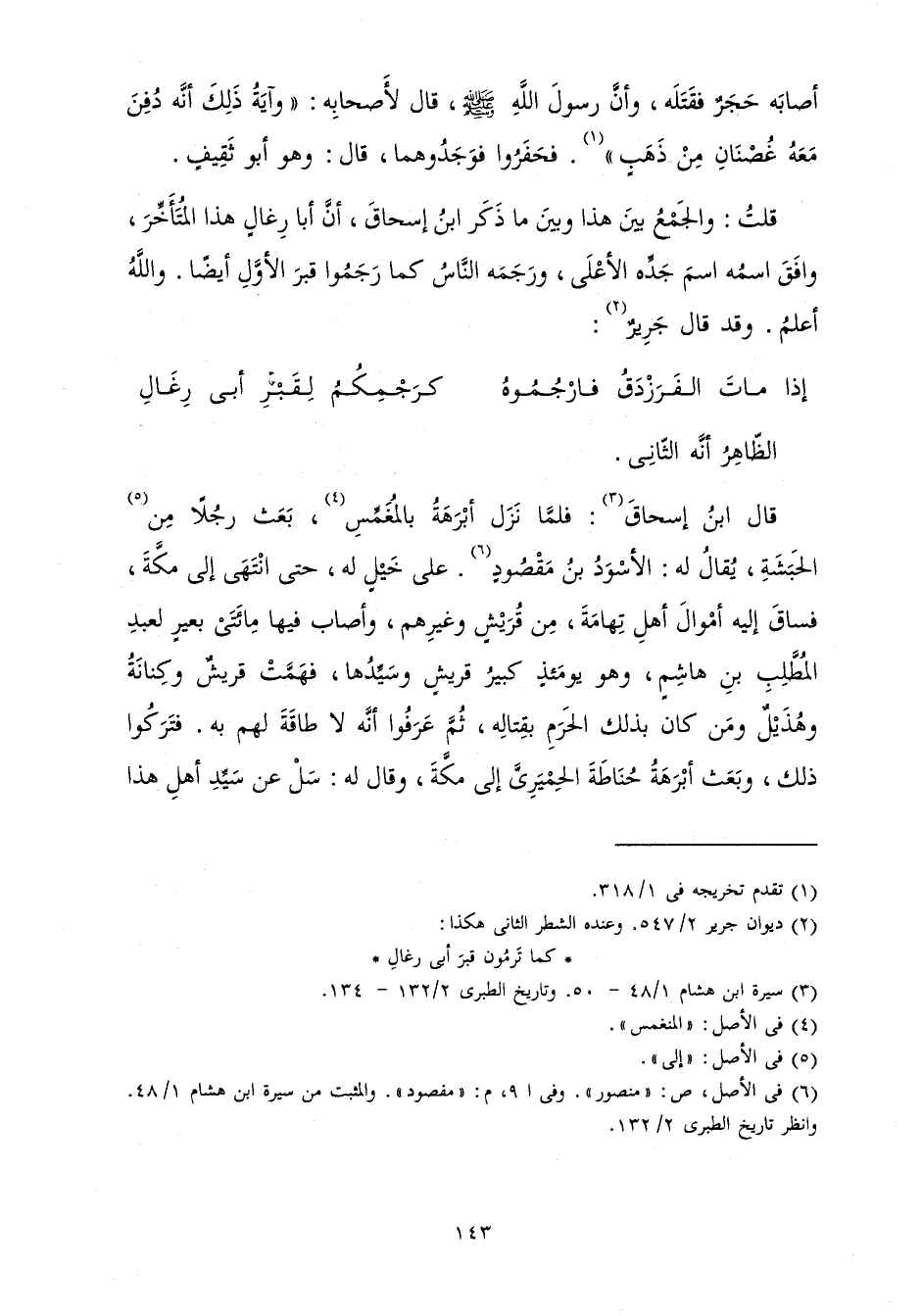 قُلْتُ: وَالْجَمْعُ بَيْنَ هَذَا وَبَيْنَ مَا ذَكَرَ ابْنُ إِسْحَاقَ أَنَّ أَبَا رِغَالٍ هَذَا الْمُتَأَخِّرَ وَافَقَ اسْمُهُ اسْمَ جَدِّهِ الْأَعْلَى، وَرَجَمَهُ النَّاسُ كَمَا رَجَمُوا قَبْرَ الْأَوَّلِ. وَأَيْضًا. وَاللَّهُ أَعْلَمُ. وَقَدْ قَالَ جَرِيرٌ